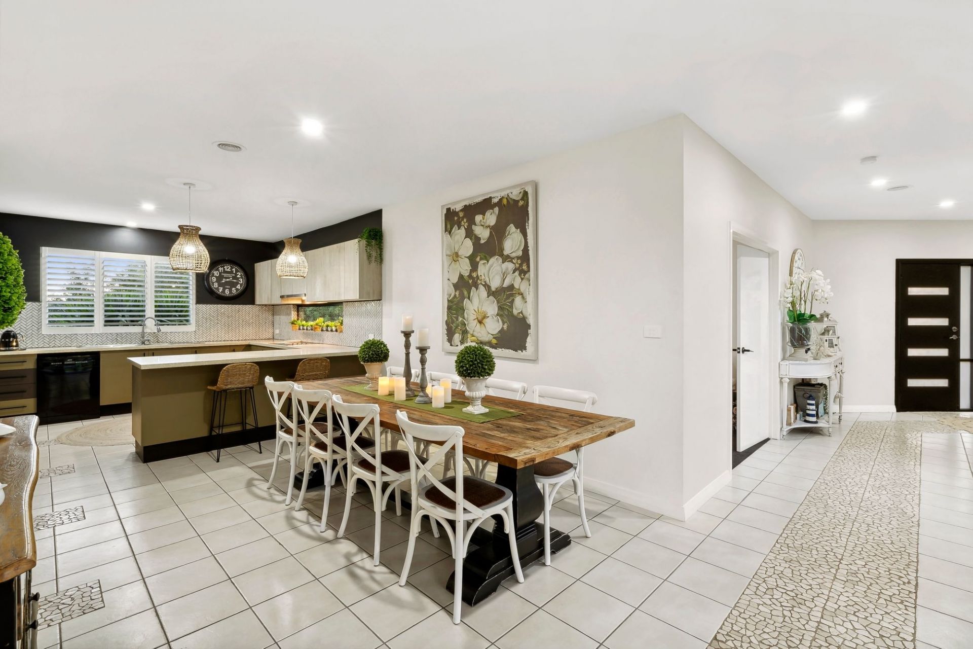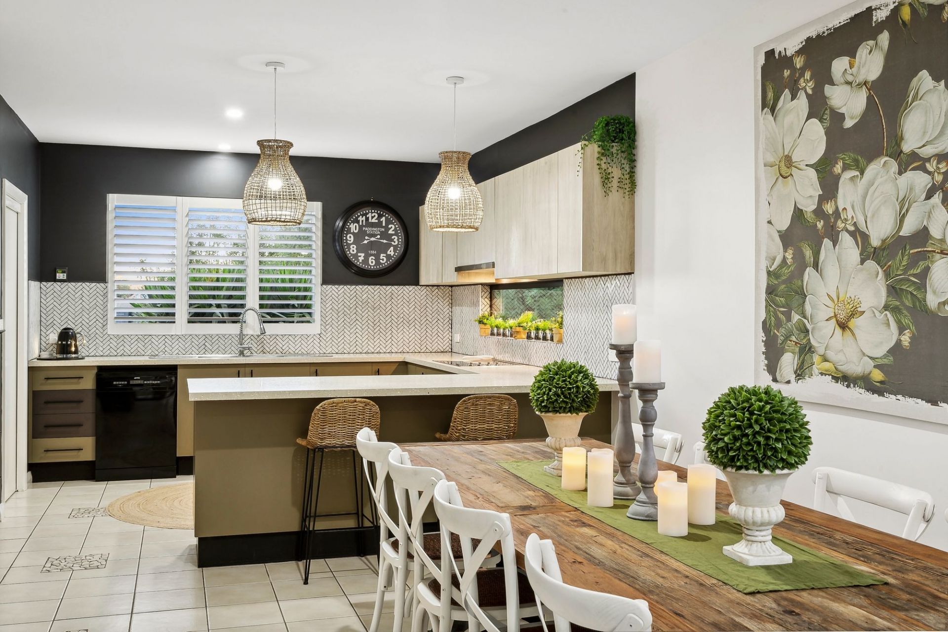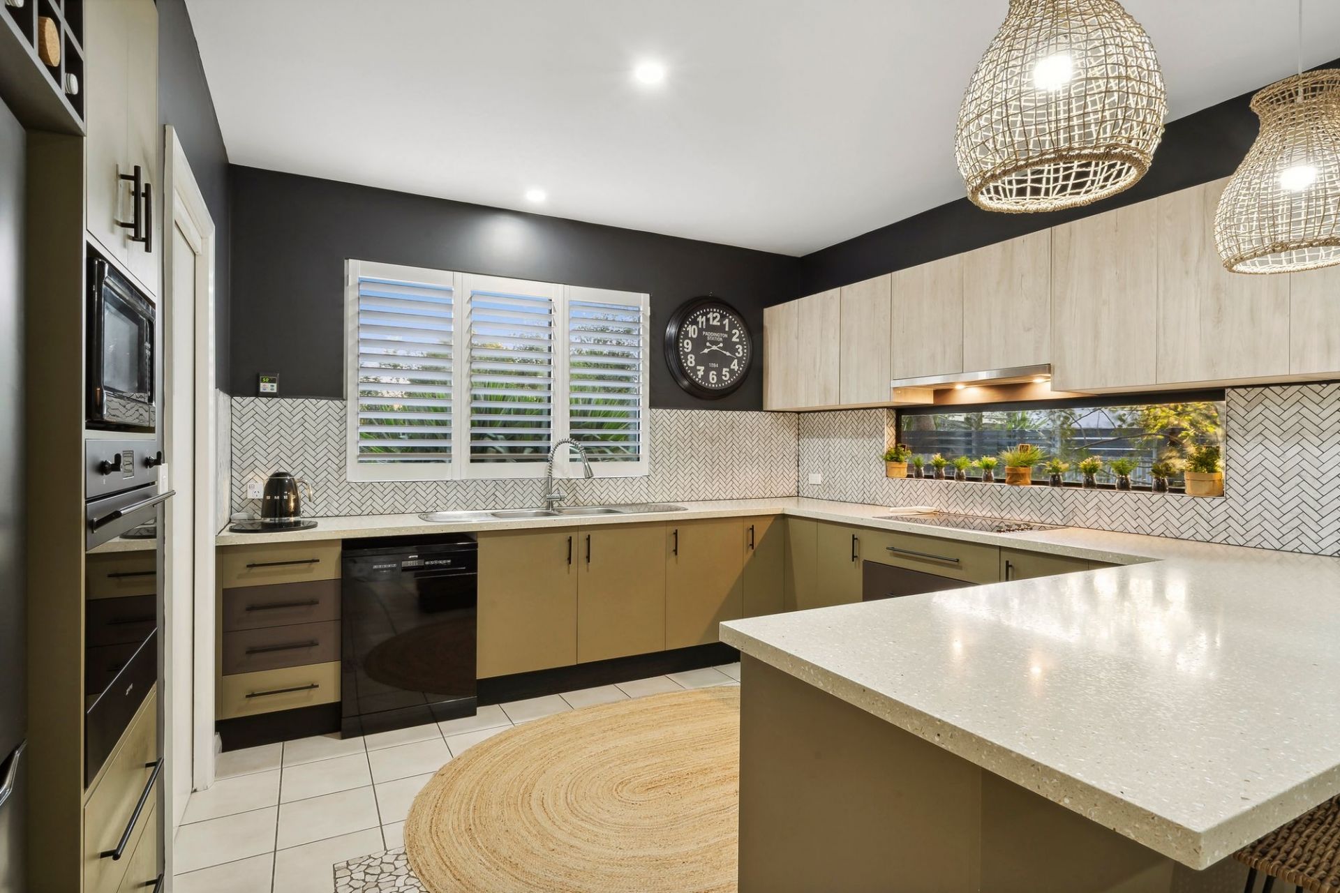 -Gourmet kitchen equipped with all black Smeg appliances including 900mm cooktop, oven, dishwasher, stone benchtops & walk-in pantry