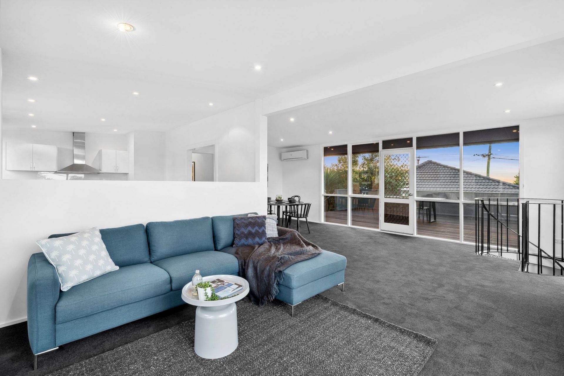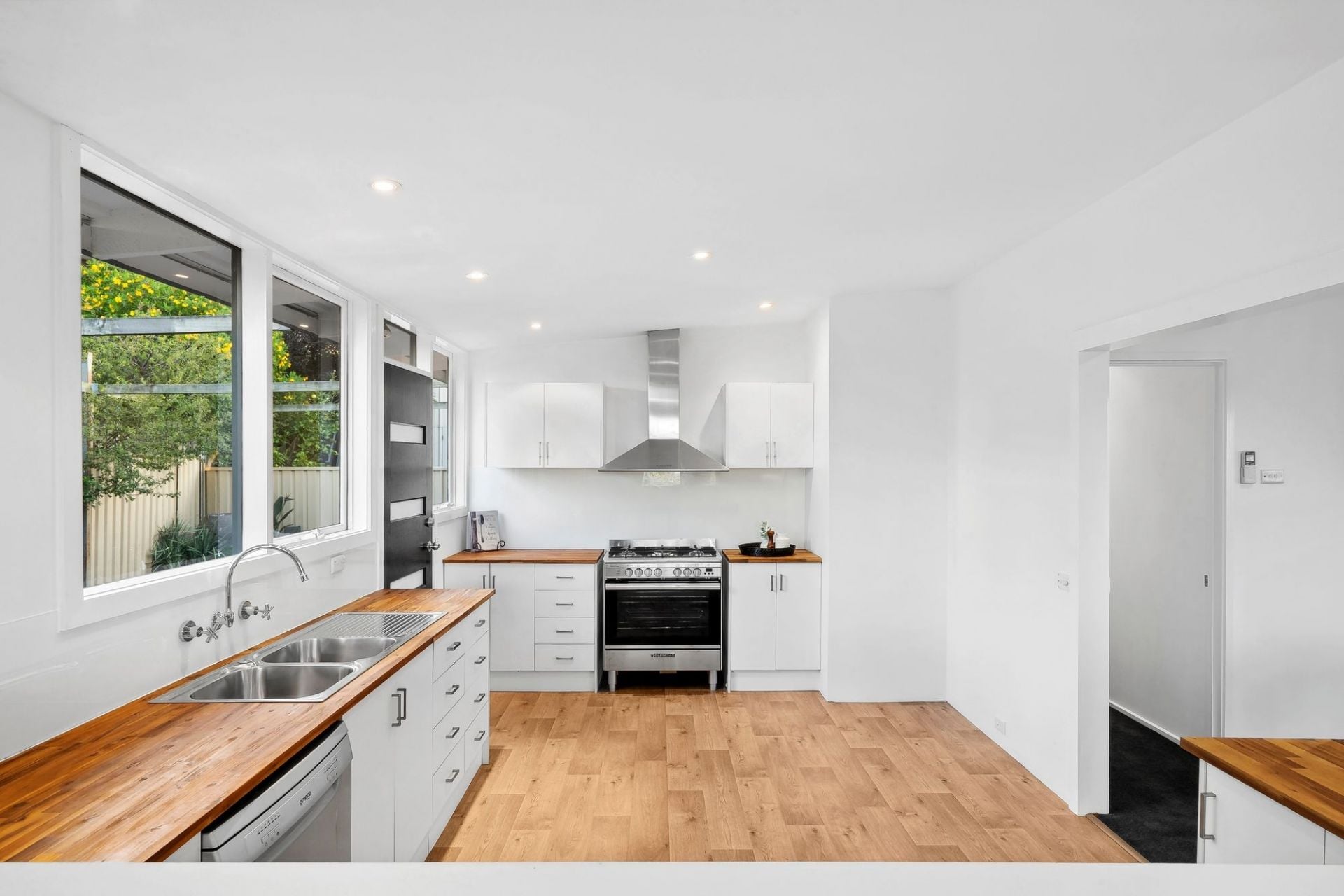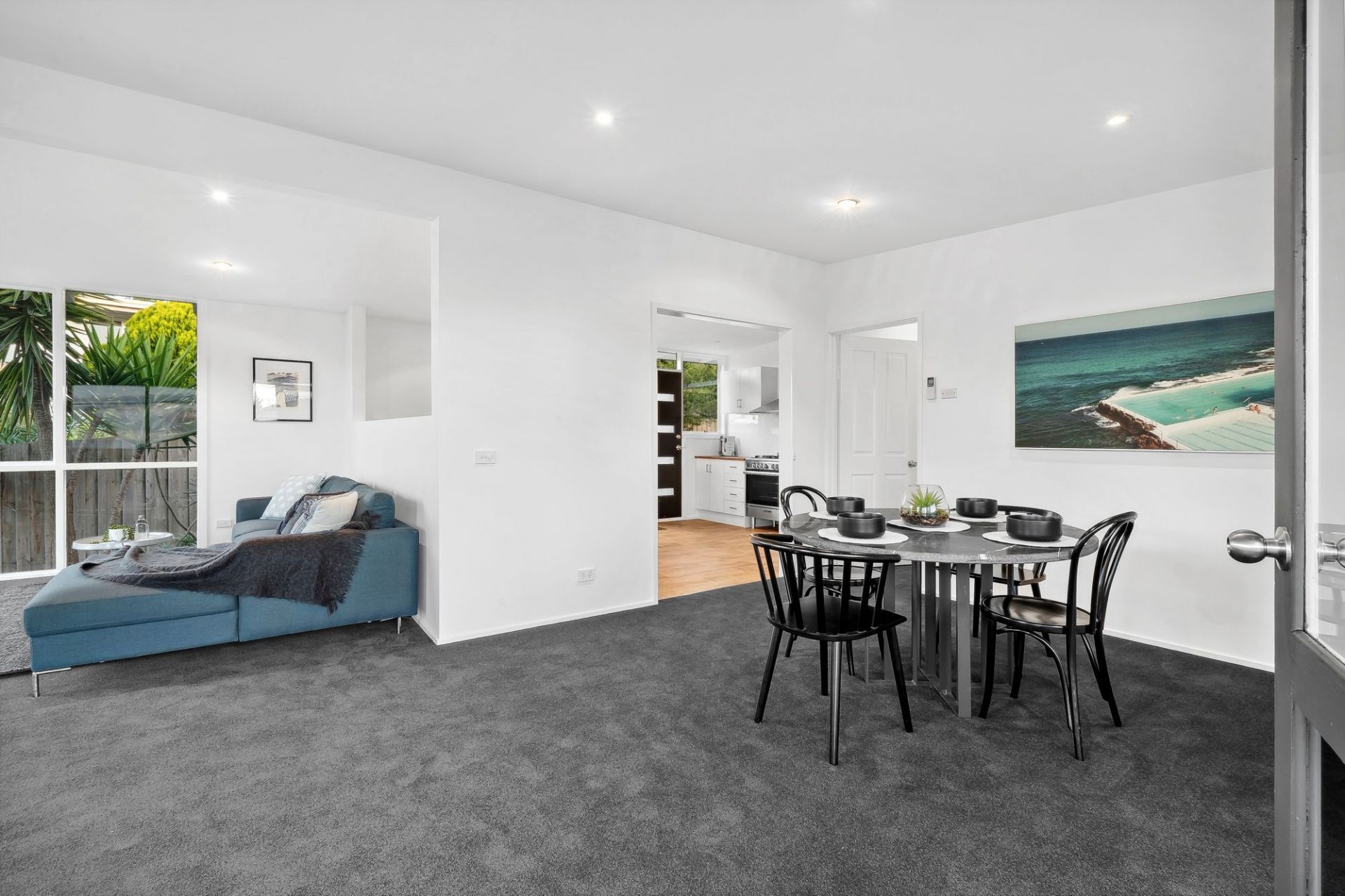 -Open connection to a spacious kitchen featuring 800mm freestanding oven, dishwasher + and abundance of bench space
