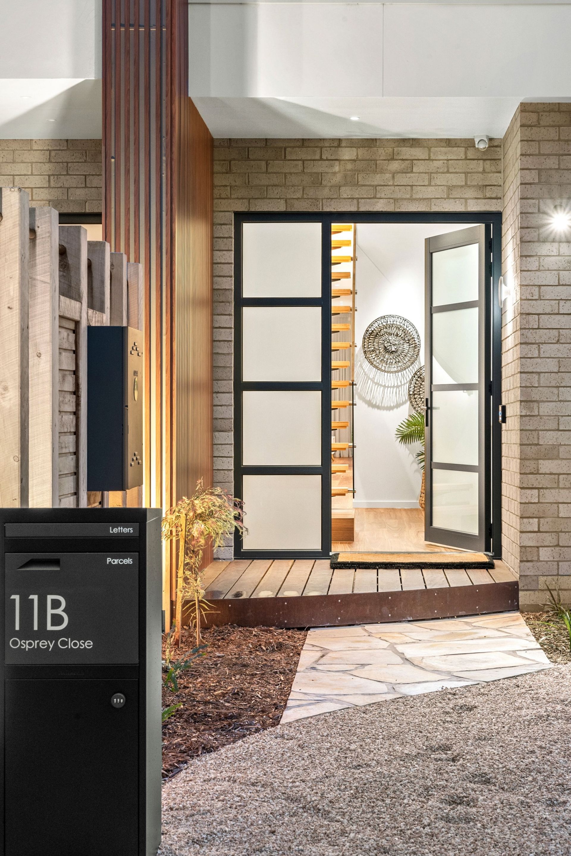 -Beyond a statement façade with feature knotwood cladding, the home welcomes with 3m high ceilings for an instant sense of luxe