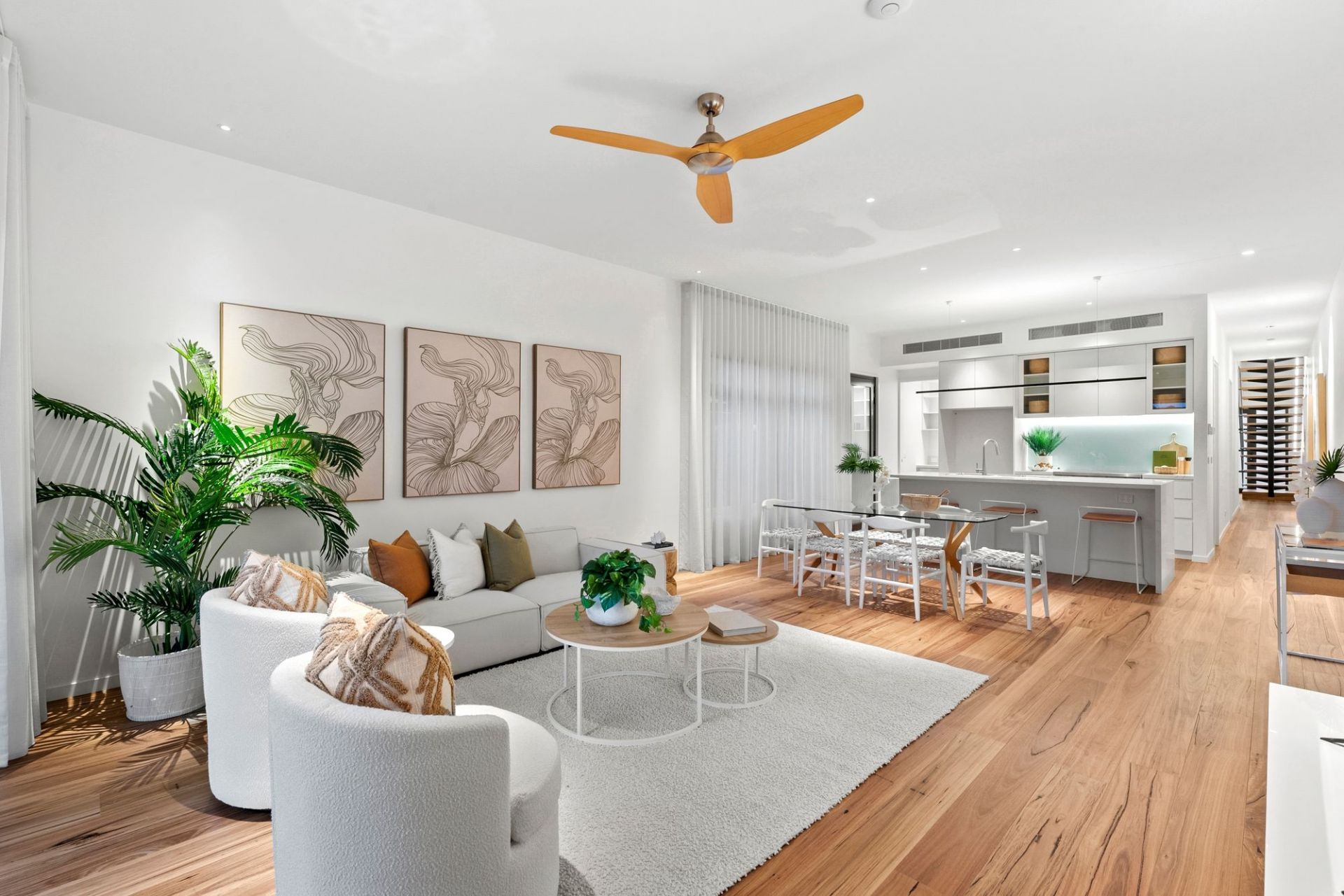 -Engineered blackbutt flooring brings warmth & character to the breezy coastal aesthetic