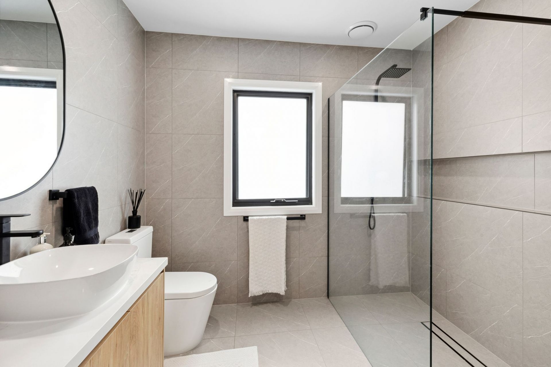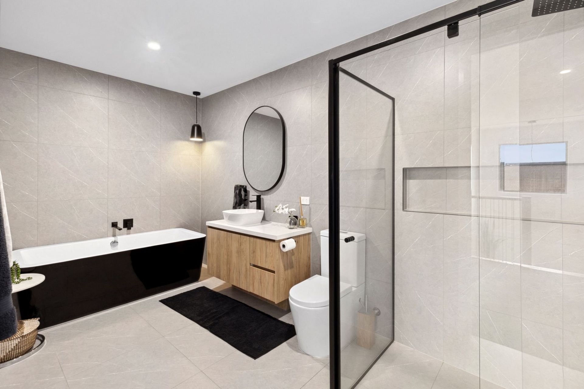 -All three bathrooms feature stone benchtops & full tiling, main bathroom includes sumptuous back-to-wall freestanding tub