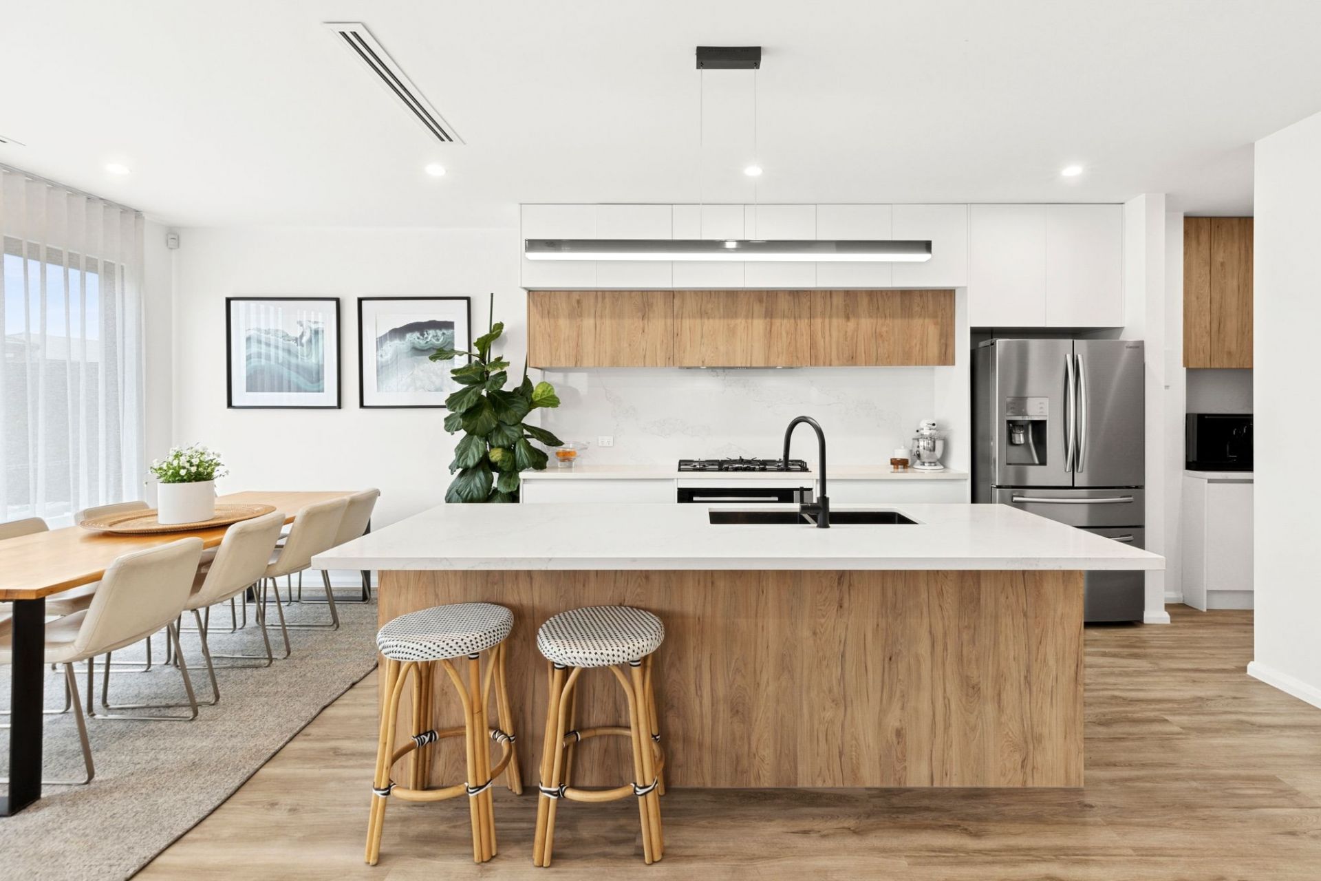 -A showstopping stone kitchen unveils a central breakfast island bench & extensive storage including gas-lift overhead cupboards