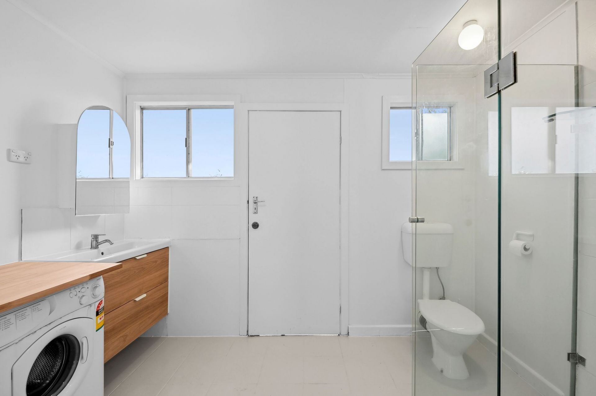 -Beautifully renovated bathroom/laundry, with oversized glass-framed shower