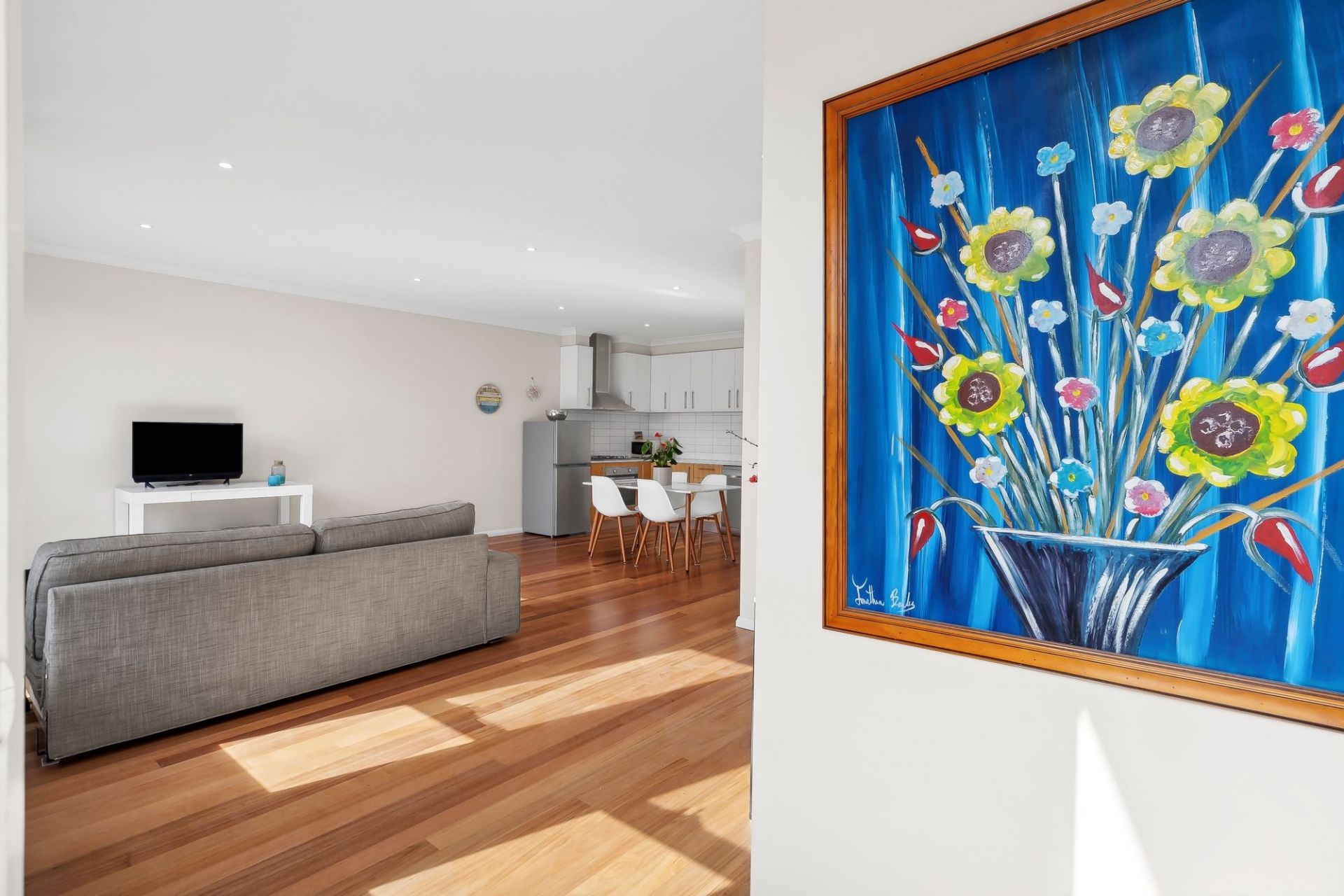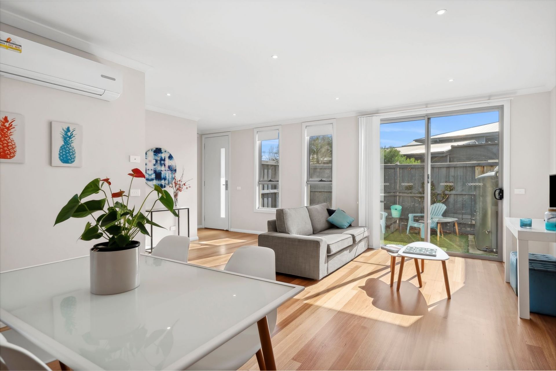 Overflowing with an effortless coastal ambience over two light-filled levels, this blissful beachside home pairs lock-and-leave liveability with prized positioning within a short walk of the Ocean Grove coastline. A bright and breezy open plan layout instantly impresses with its Tasmanian Oak flooring, fresh palette, and the warmth of northern light, while opening onto a private, sun-kissed courtyard. An idyllic seaside downsizer, fuss-free weekender, or lucrative investment that would thrive on the short-term rental market, the home is finished with two comfortable bedrooms plus an upstairs entertainer’s balcony where you can soak up the ocean breezes and views over the sand dunes.