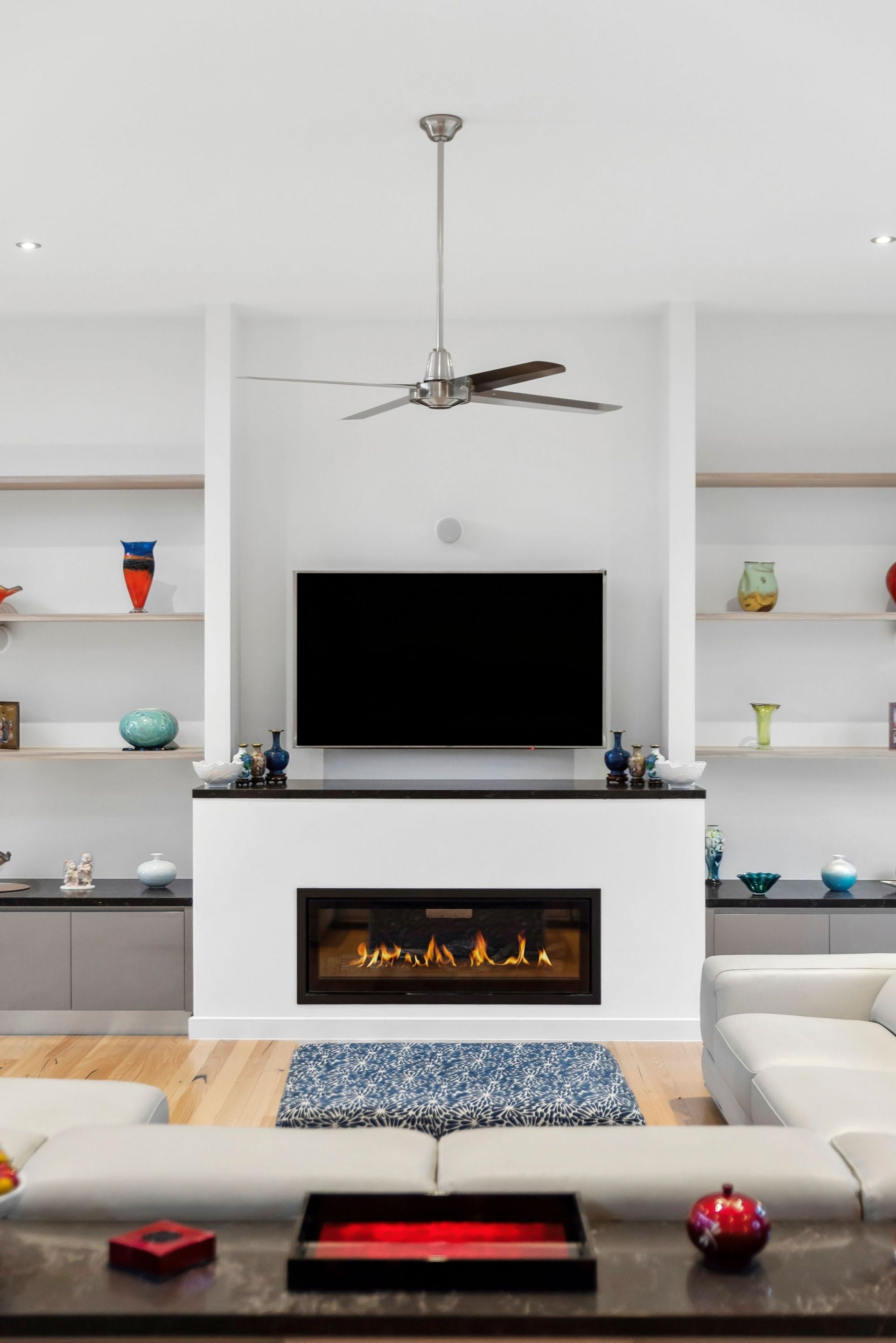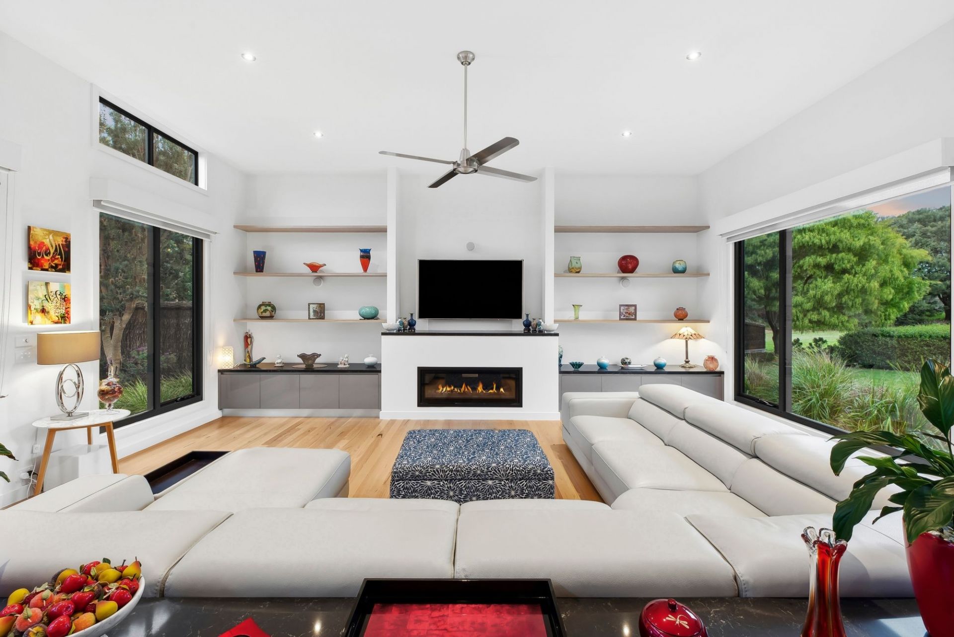 -Feature gas log fireplace, complemented by smart integrated ducted heating/cooling system