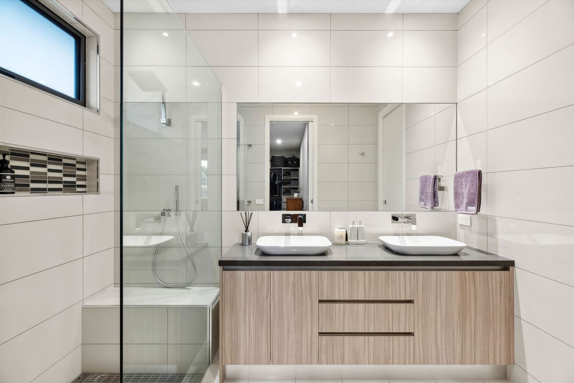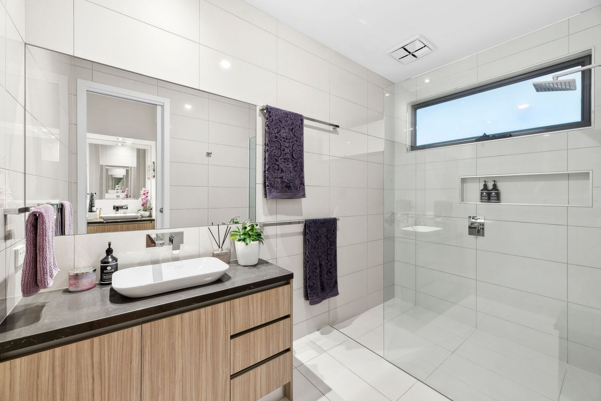 -Stylish central bathroom with modern finishes, & adjacent guest powder room