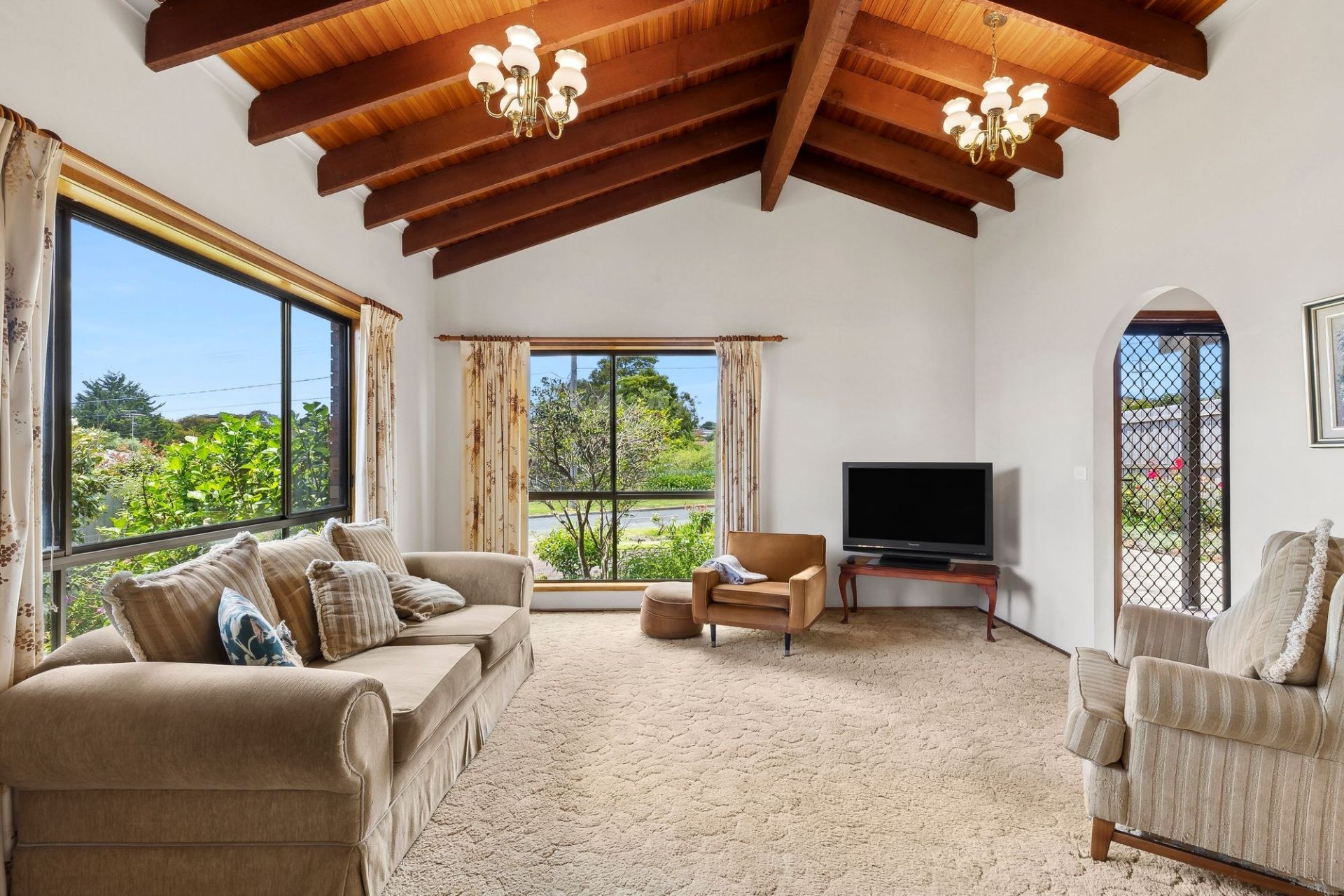 -Main living room delights with its pitched, timber-lined ceiling & lashings of natural light