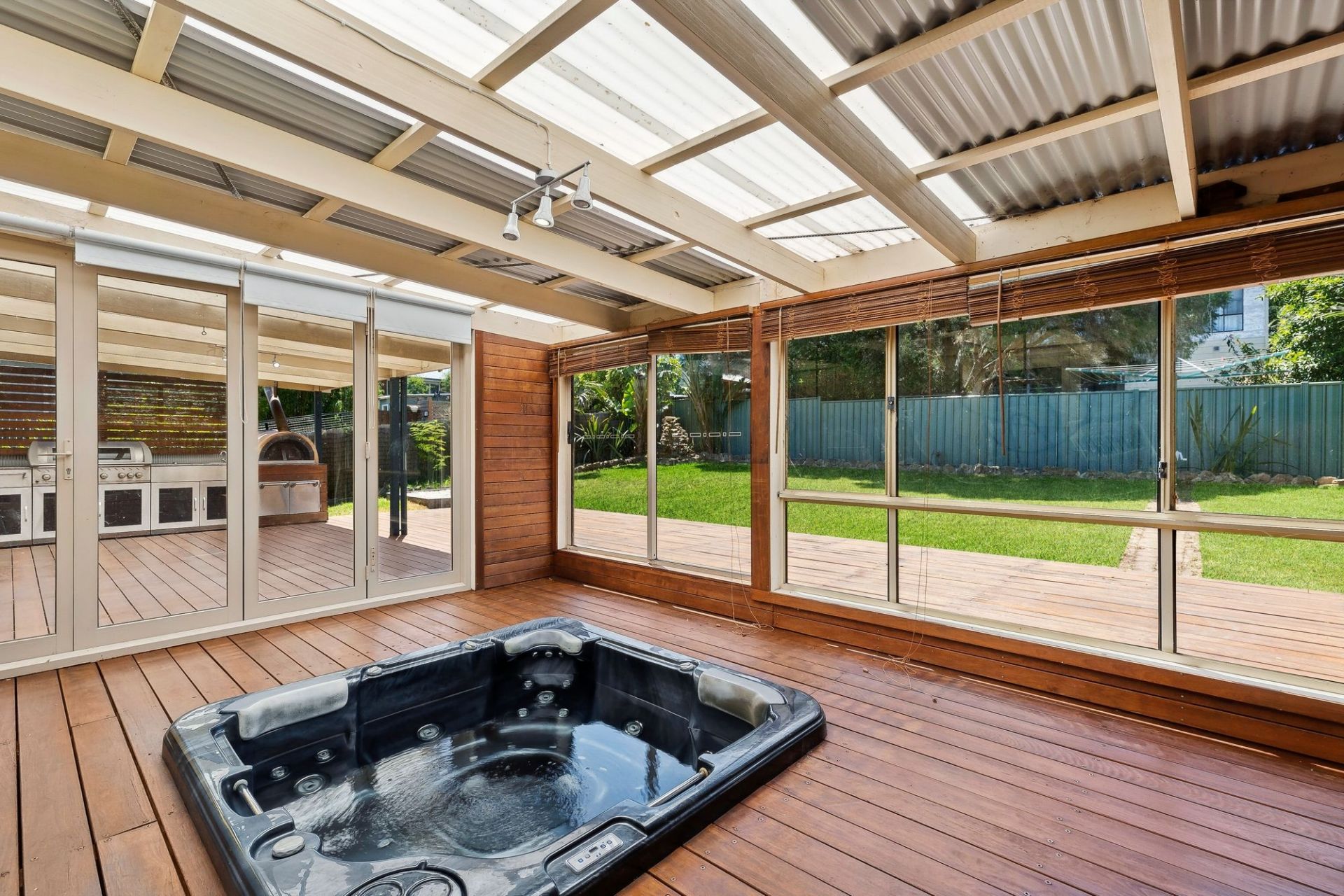 -Bi-fold doors retract to reveal an indoor-outdoor spa room, the ideal place to unwind as kids run freely in the expansive back yard