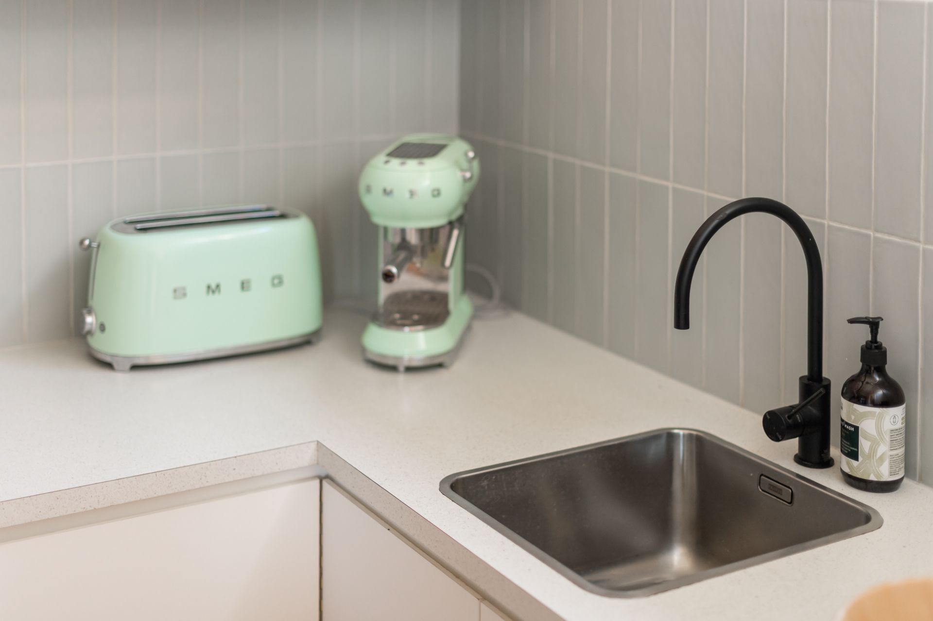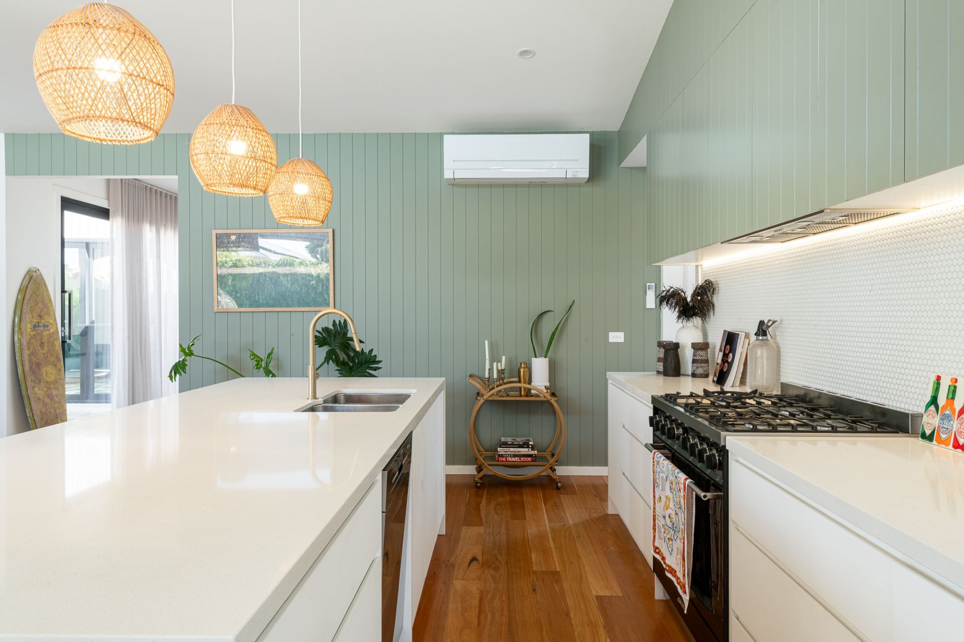 -A gourmet stone kitchen delights with premium Smeg appliances, Franke double sink & custom VJ panelled cabinetry