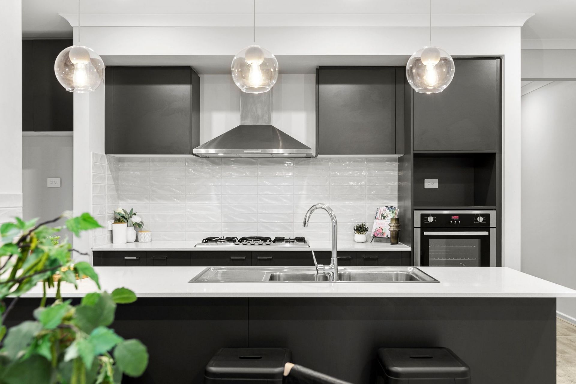 -A glossy kitchen features stone benchtops, breaky seating & feature lighting