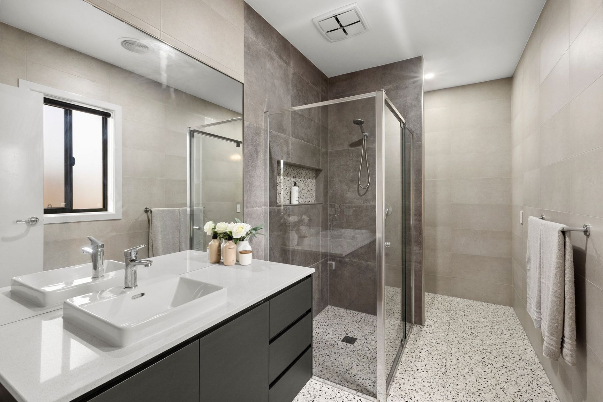 -Stylish, fully tiled ensuite with stone vanity, oversized shower, terrazzo floor tiling & underfloor heating