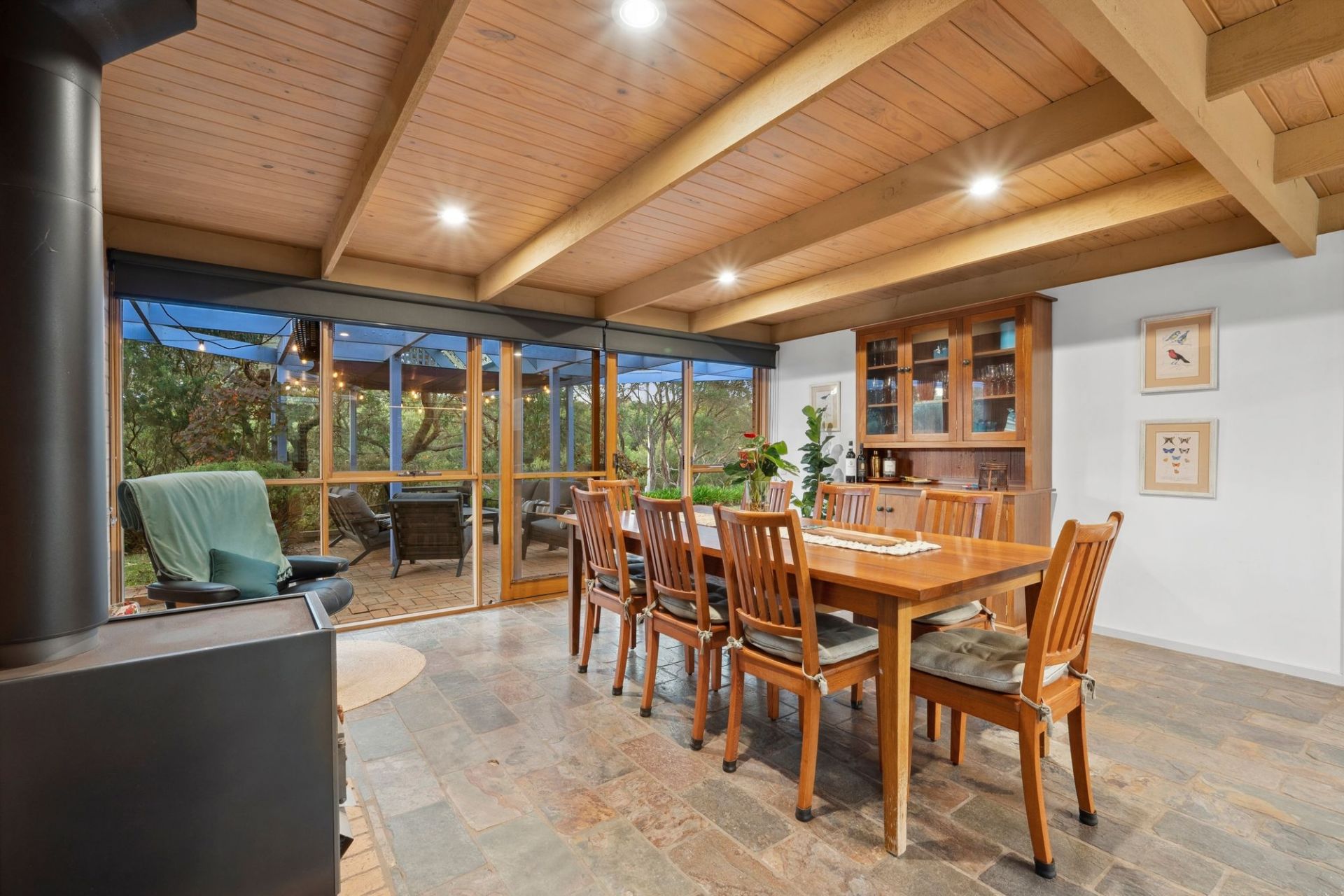 - Dual living zones with gas log fire, Pyro Classic IV woodfire, split air conditioning system, and off-peak storage heaters