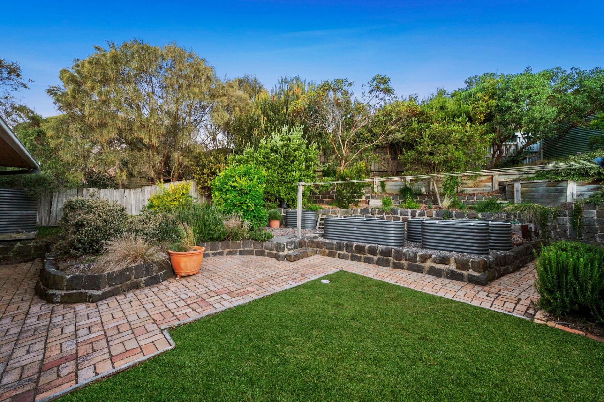 - Tiered rear yard with veggie beds, stone walling, 16kL tank, Aquanova water recycling system
