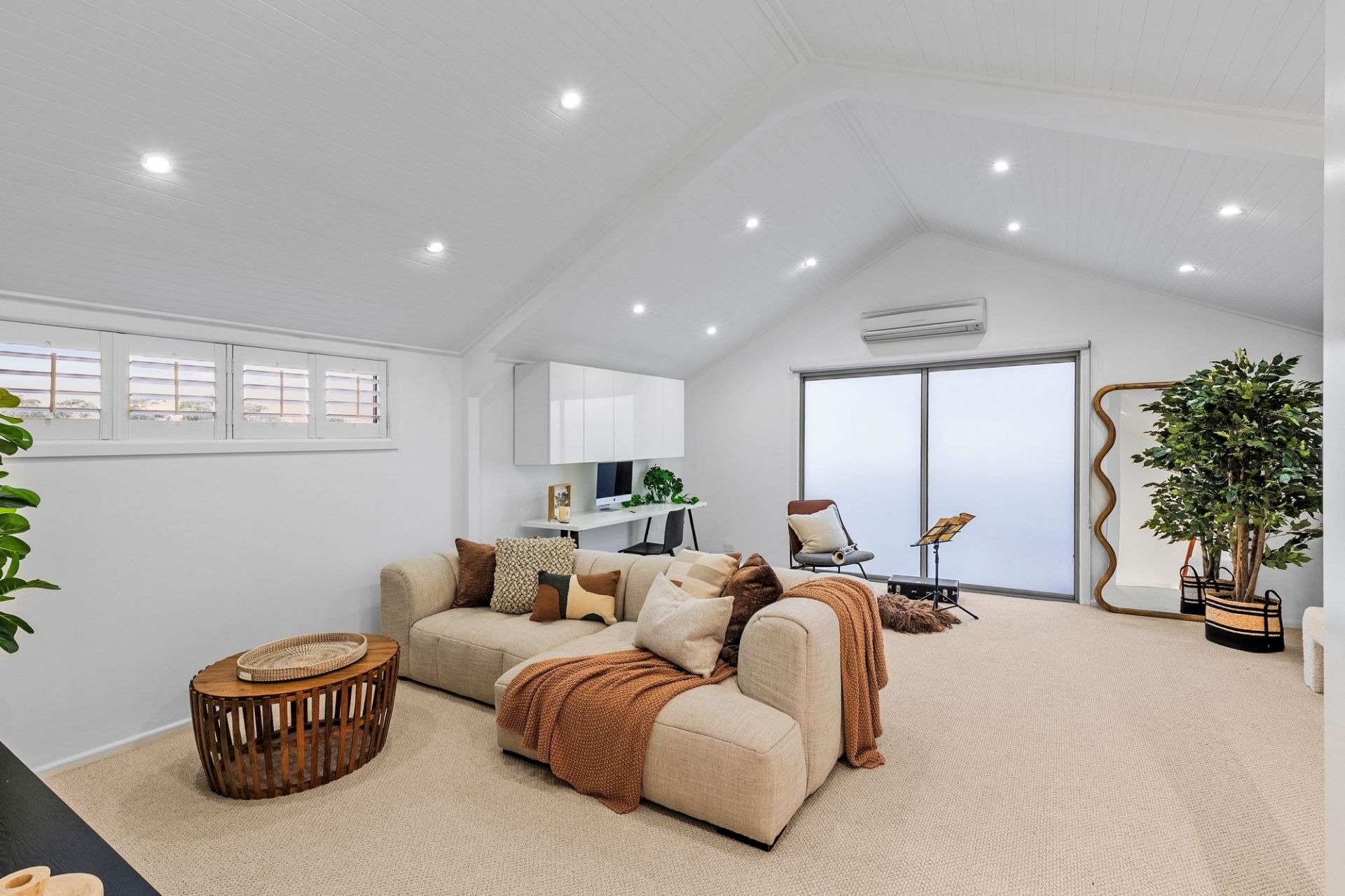 -Retreat-style upstairs living with split system, wool carpet, soaring boathouse ceiling & architectural charm