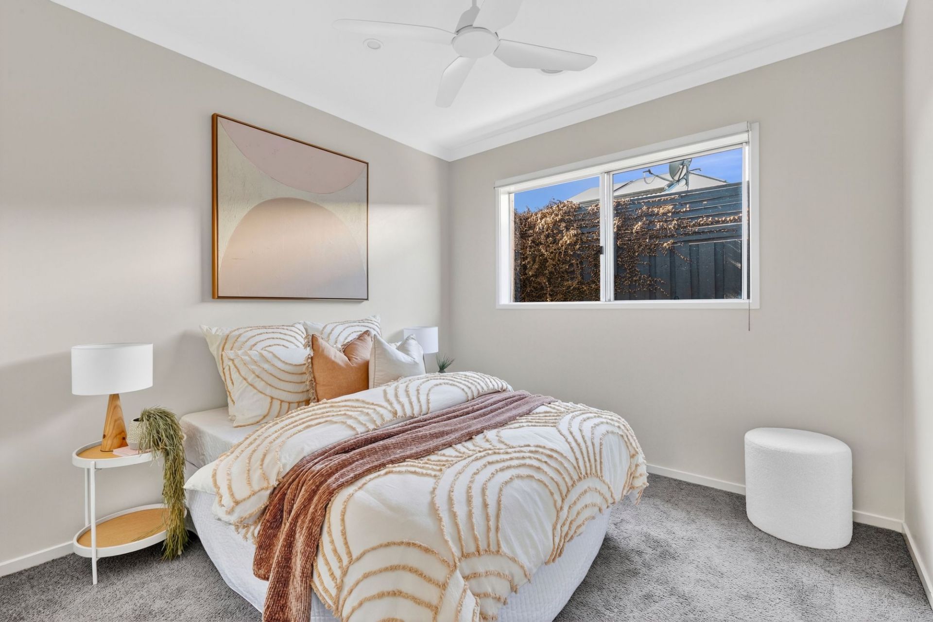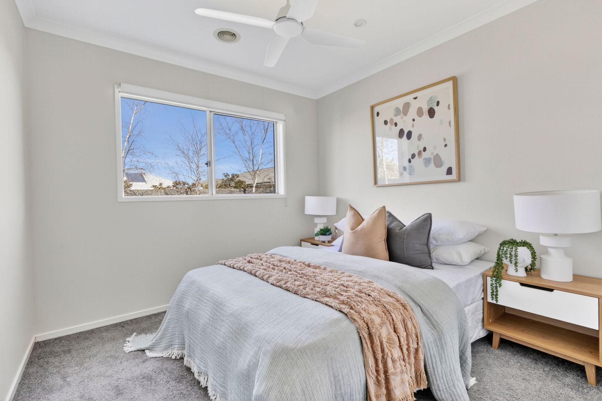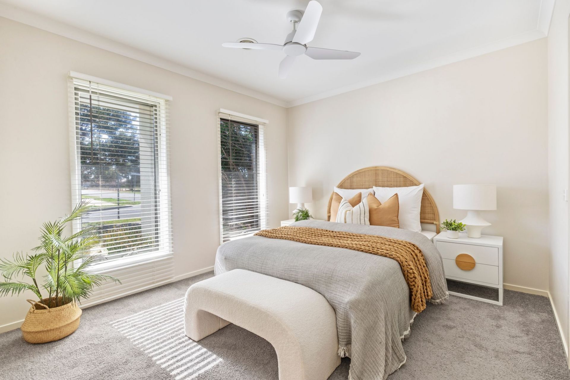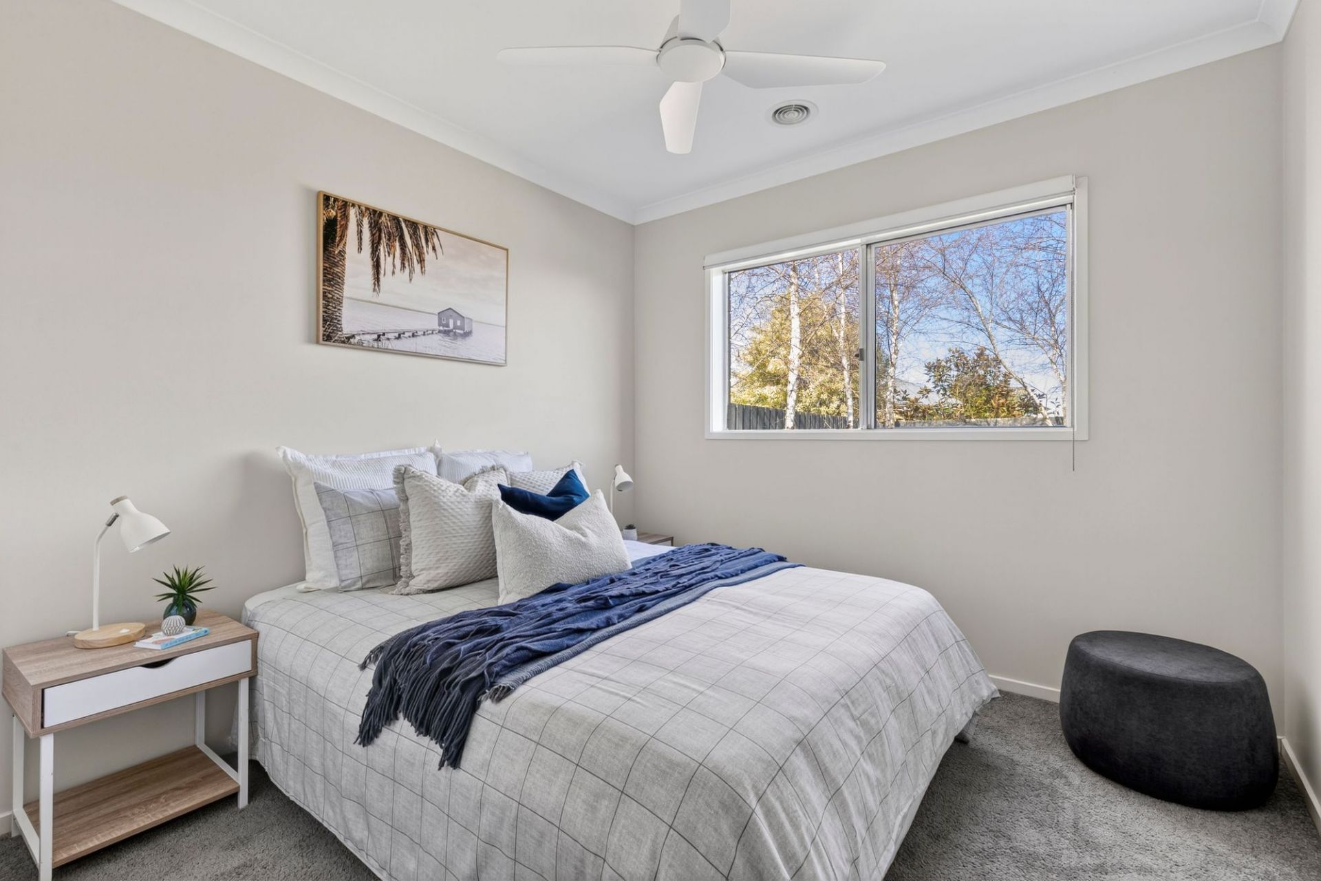 -Master bedroom with views of the front garden and quiet streetscape