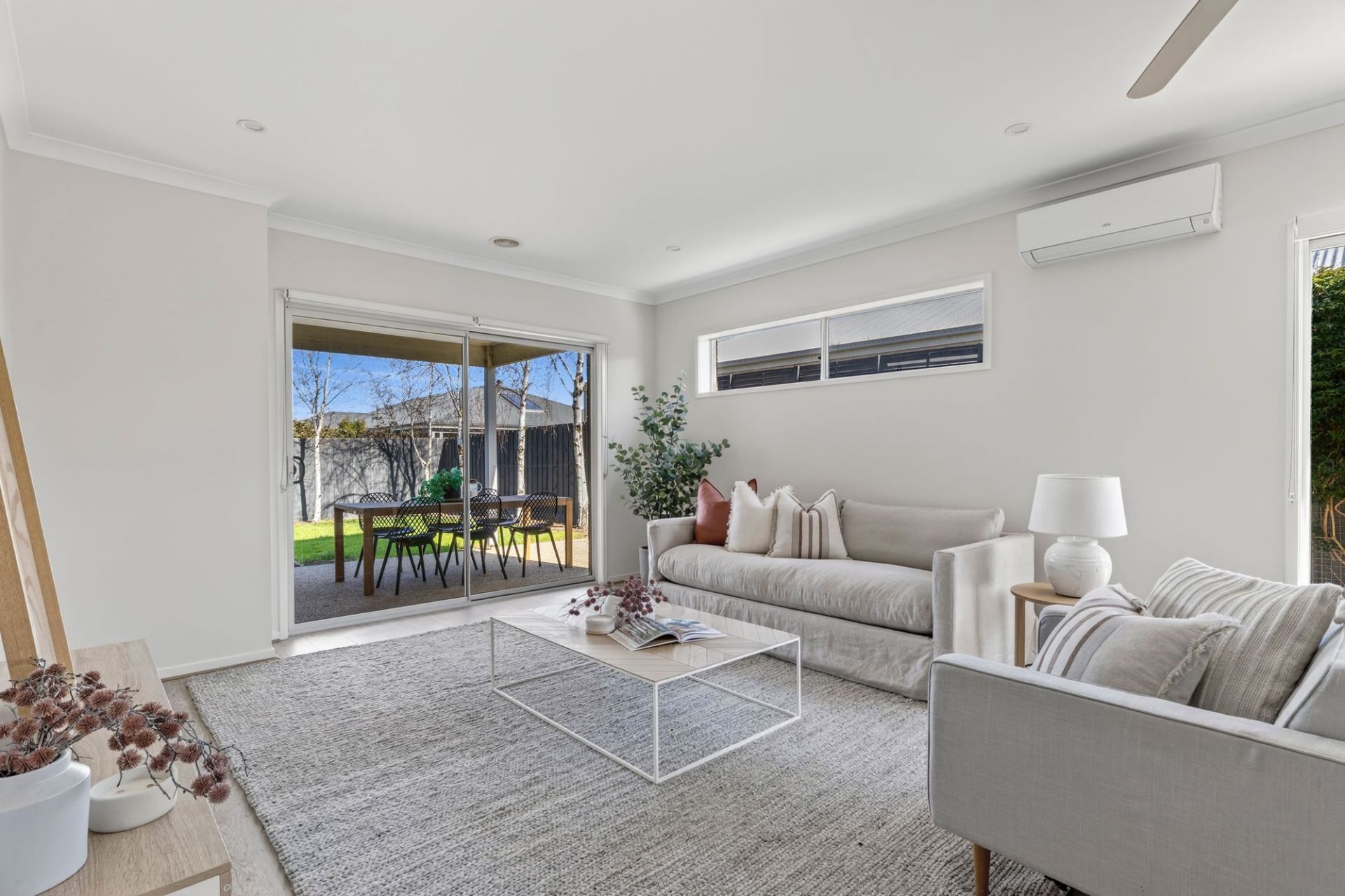 -Sliding doors access covered and sundrenched exposed aggregate entertaining spaces
