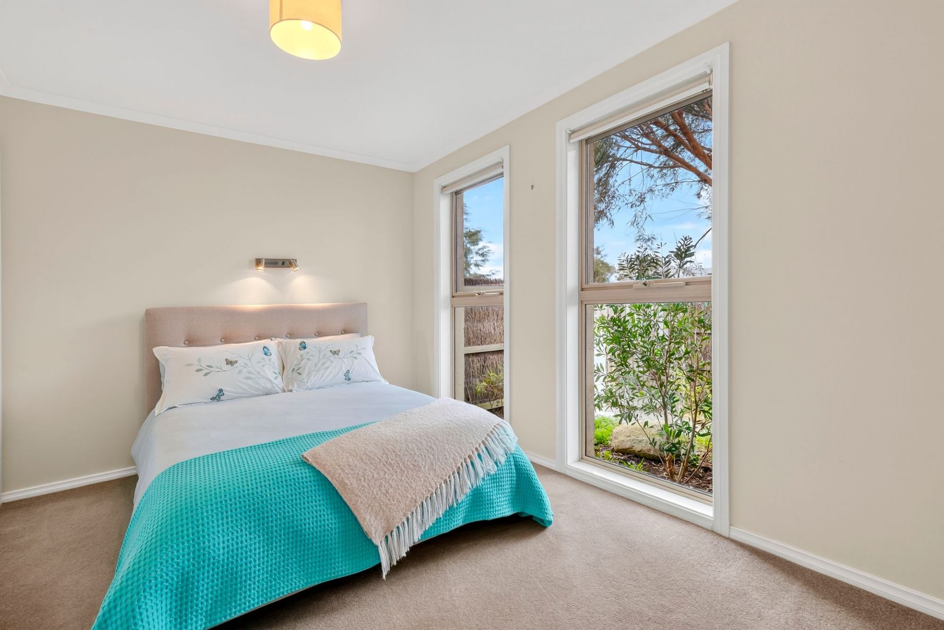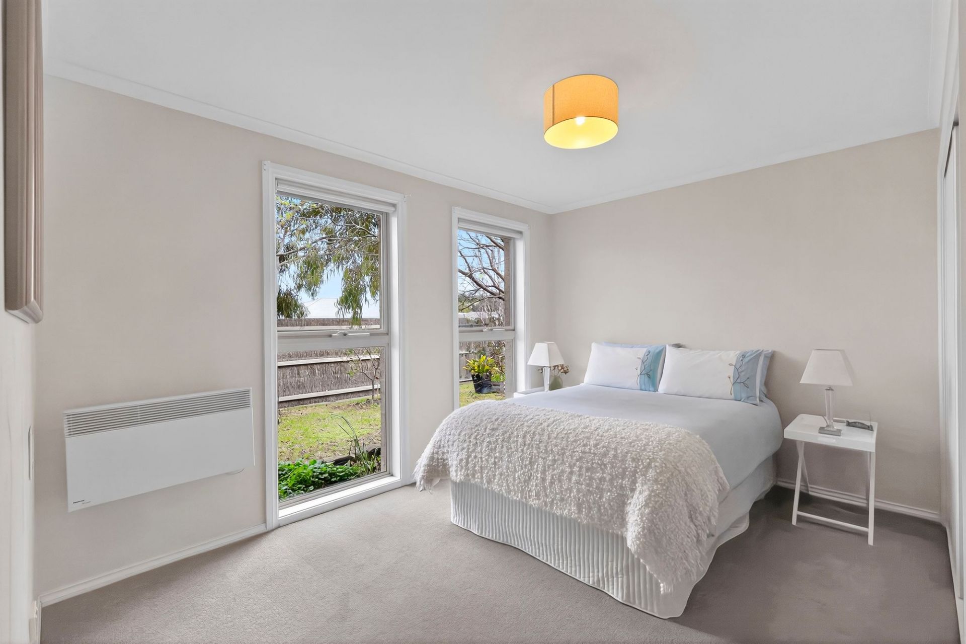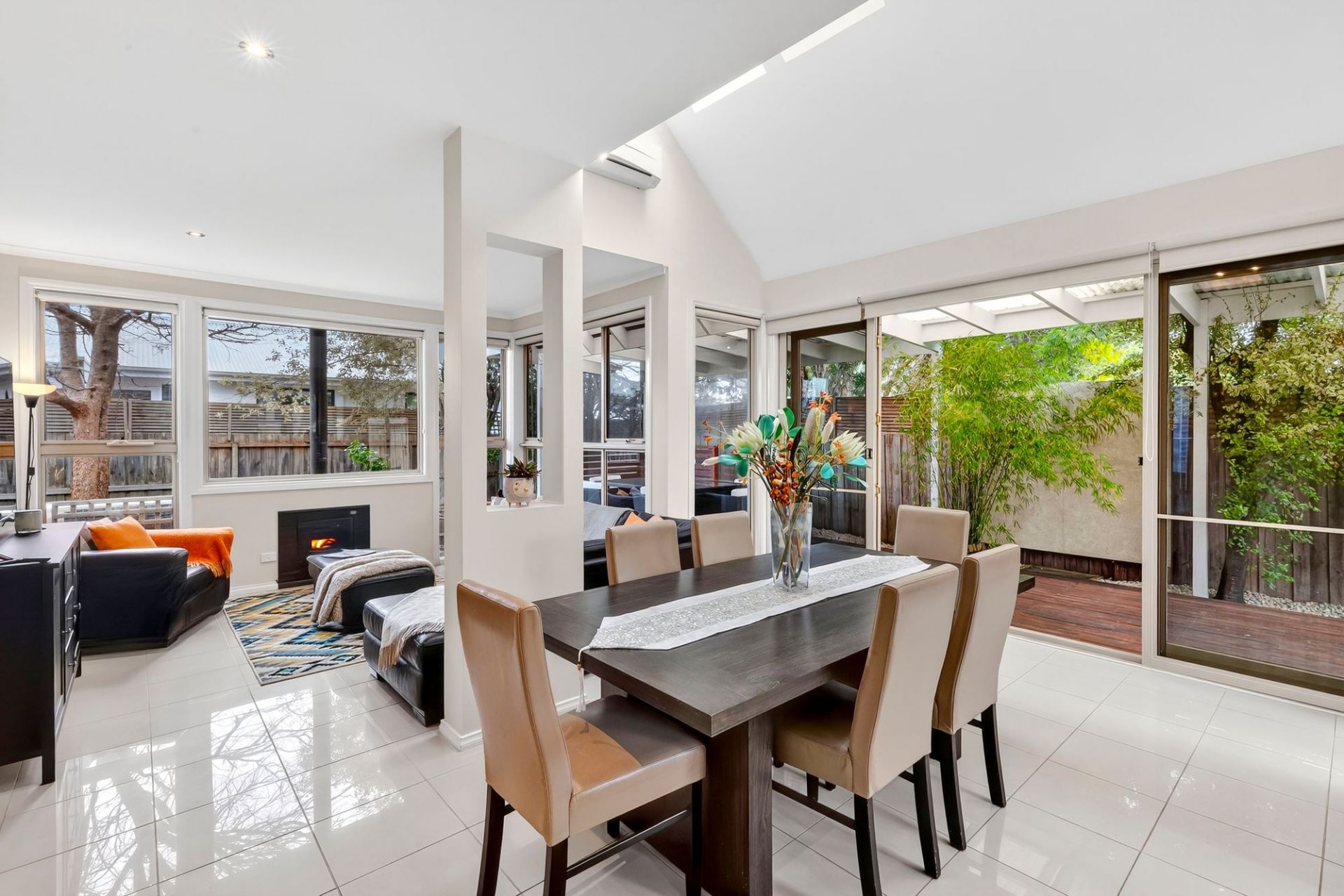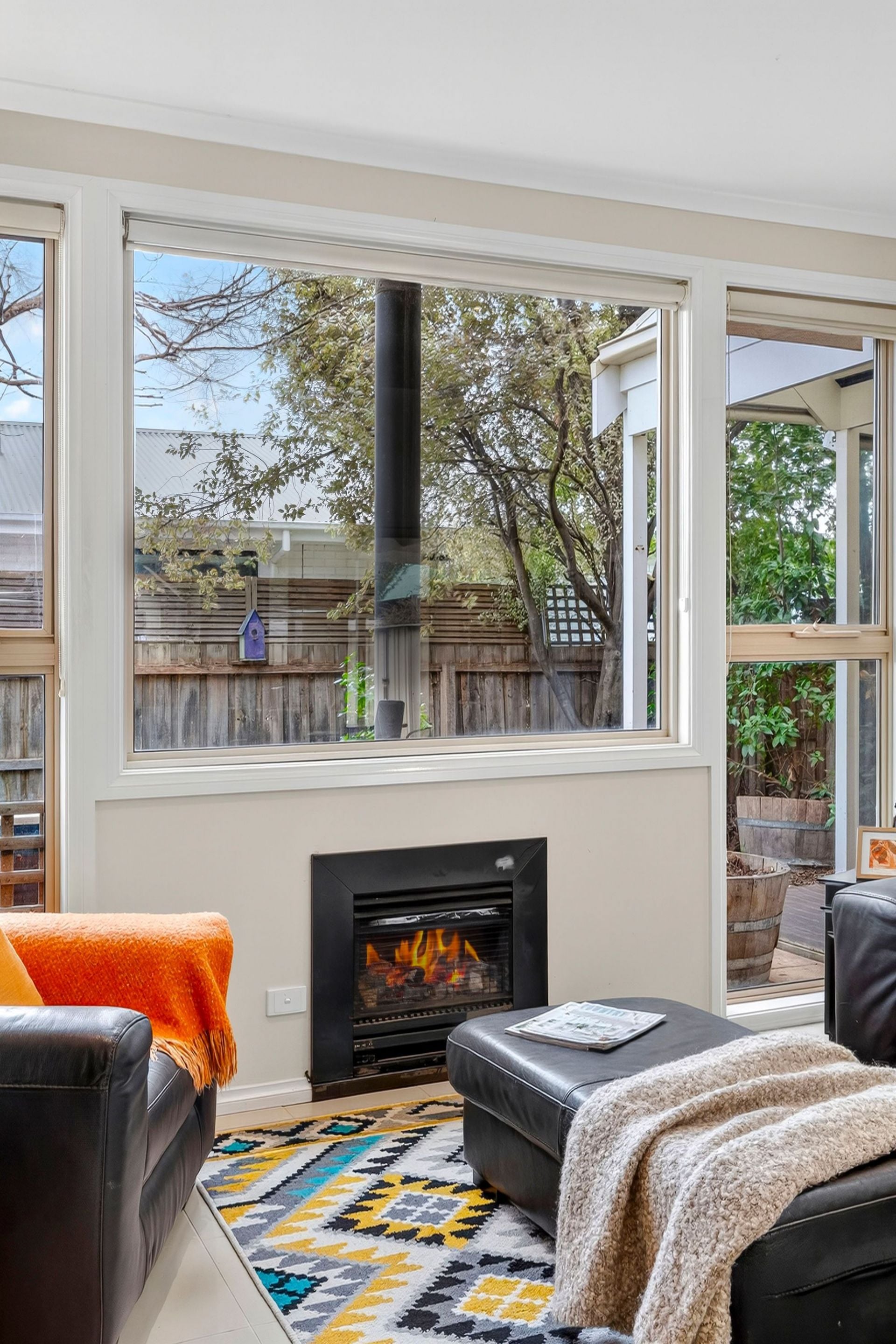 -Gas log fire, dual reverse cycle split systems, & neutral décor for year-round comfort & style