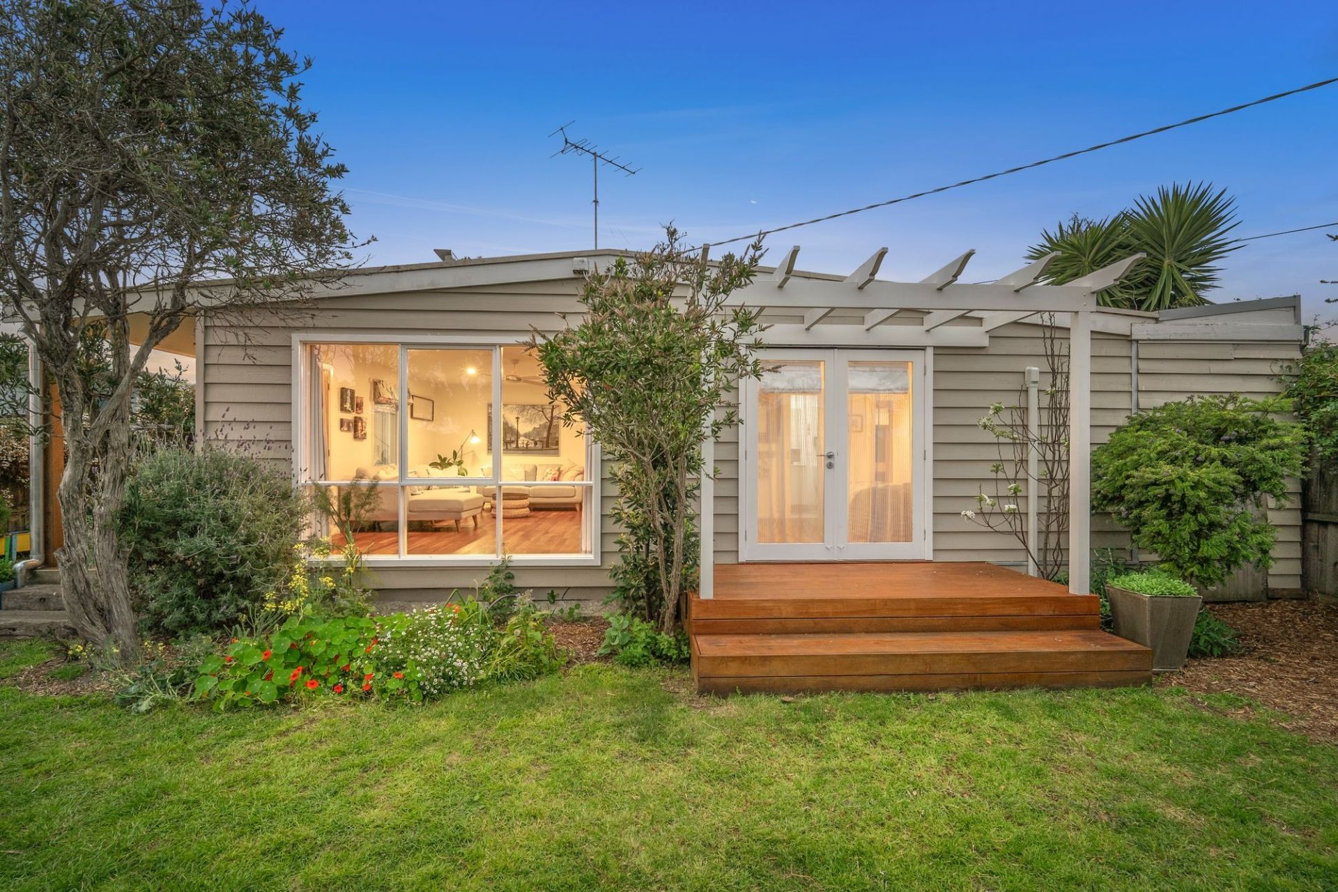 -Private behind a high fence, the home’s weatherboard façade sets a relaxed, beachy tone