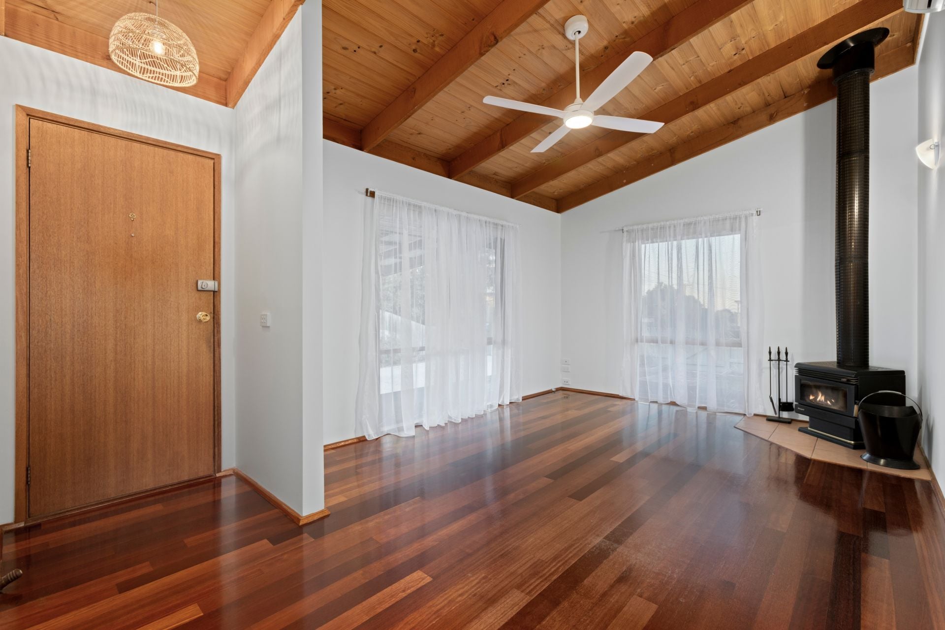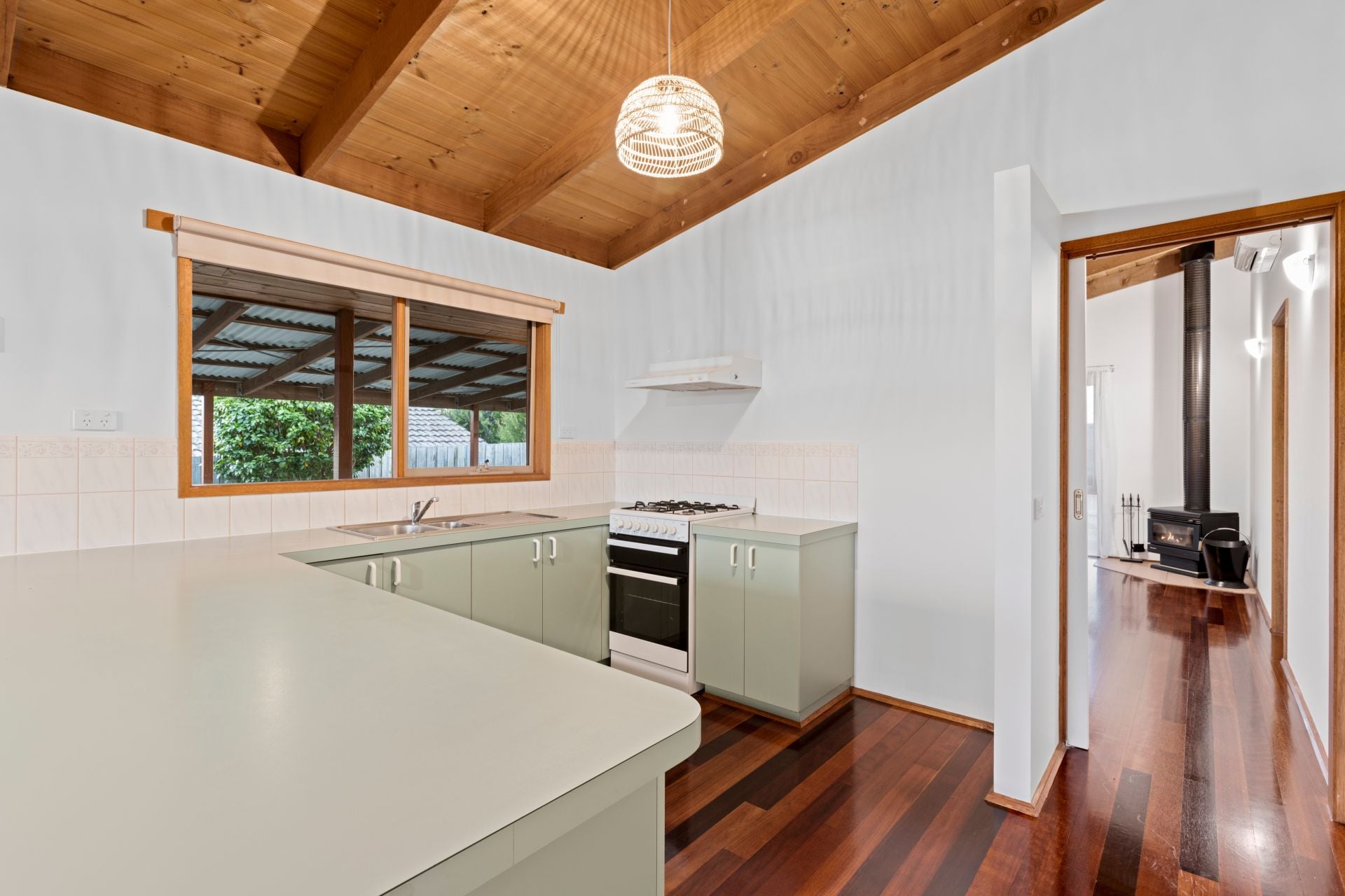 -Single level layout continues the welcoming ambience with raked timber-lined ceilings & hardwood flooring