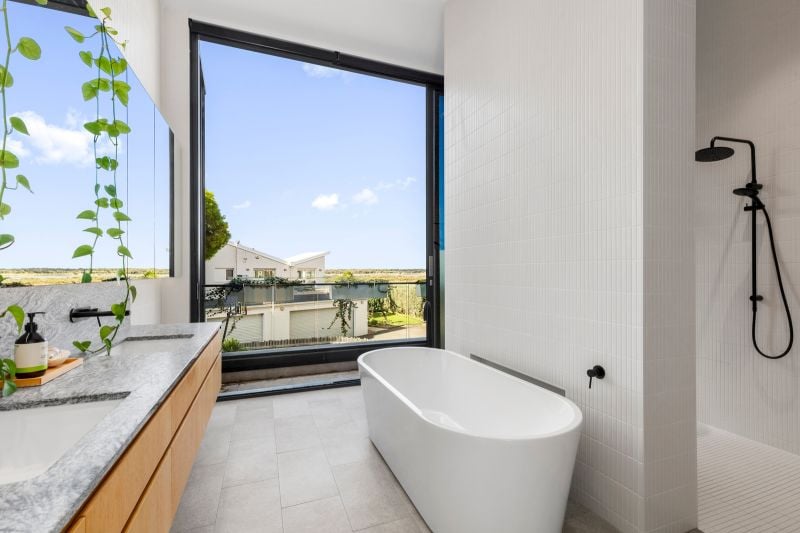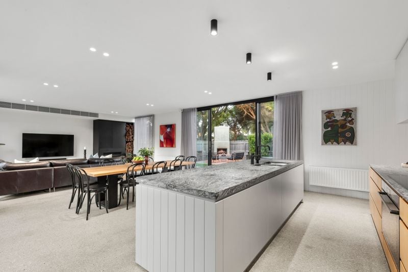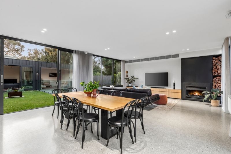 A striking architectural statement set along the banks of the Barwon River, this contemporary four-bedroom residence delivers refined luxury with an effortless coastal spirit. Designed by Travis Walton and masterfully built by Duncan Pascoe Builders, the home is a light-filled sanctuary where clean lines, soaring proportions and seamless indoor-outdoor flow define the living experience. Polished concrete floors, high square-set ceilings and expansive glazing create a sophisticated yet relaxed atmosphere, while premium finishes and thoughtful zoning ensure exceptional functionality for modern family life.