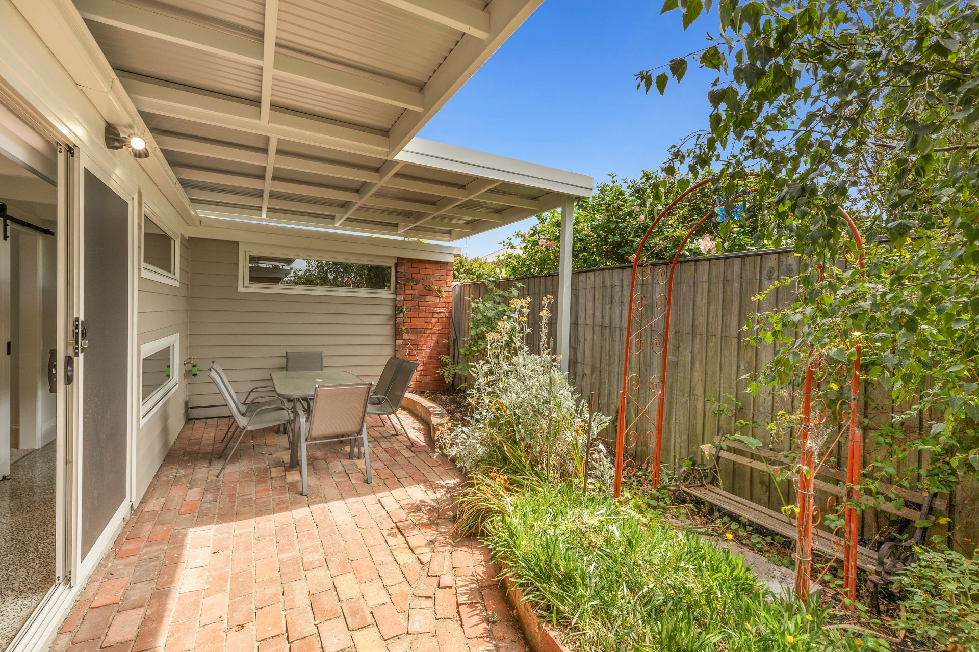 - Delightful north-facing alfresco courtyard with established garden including Silver Birch & roses
