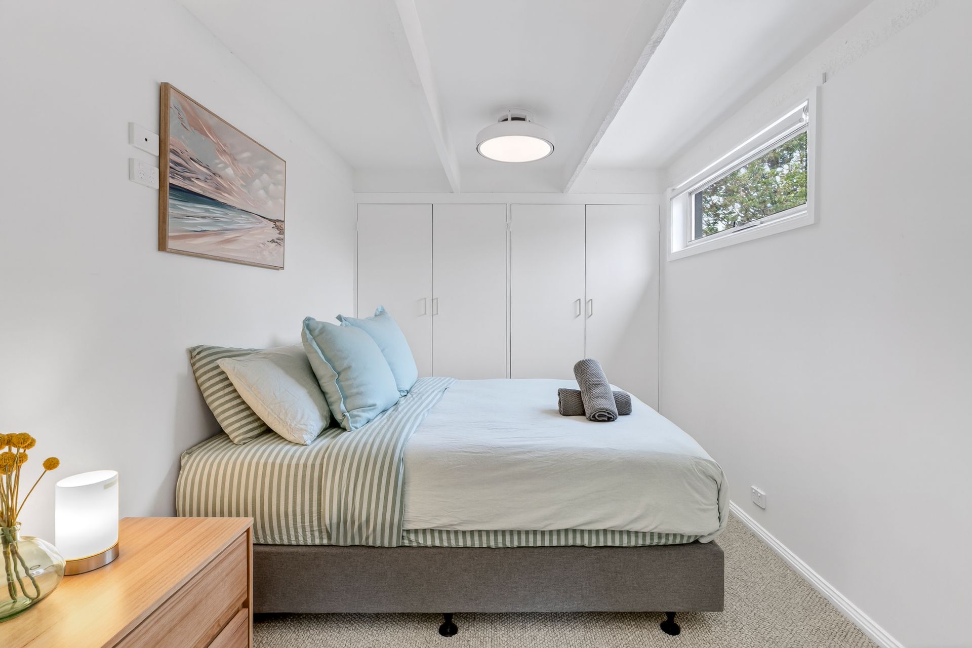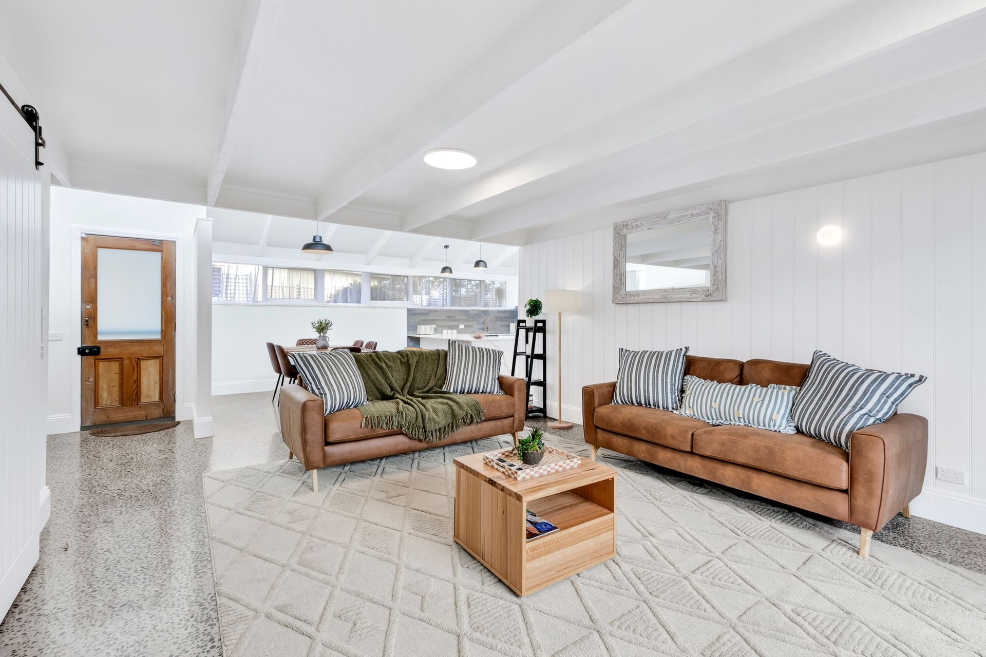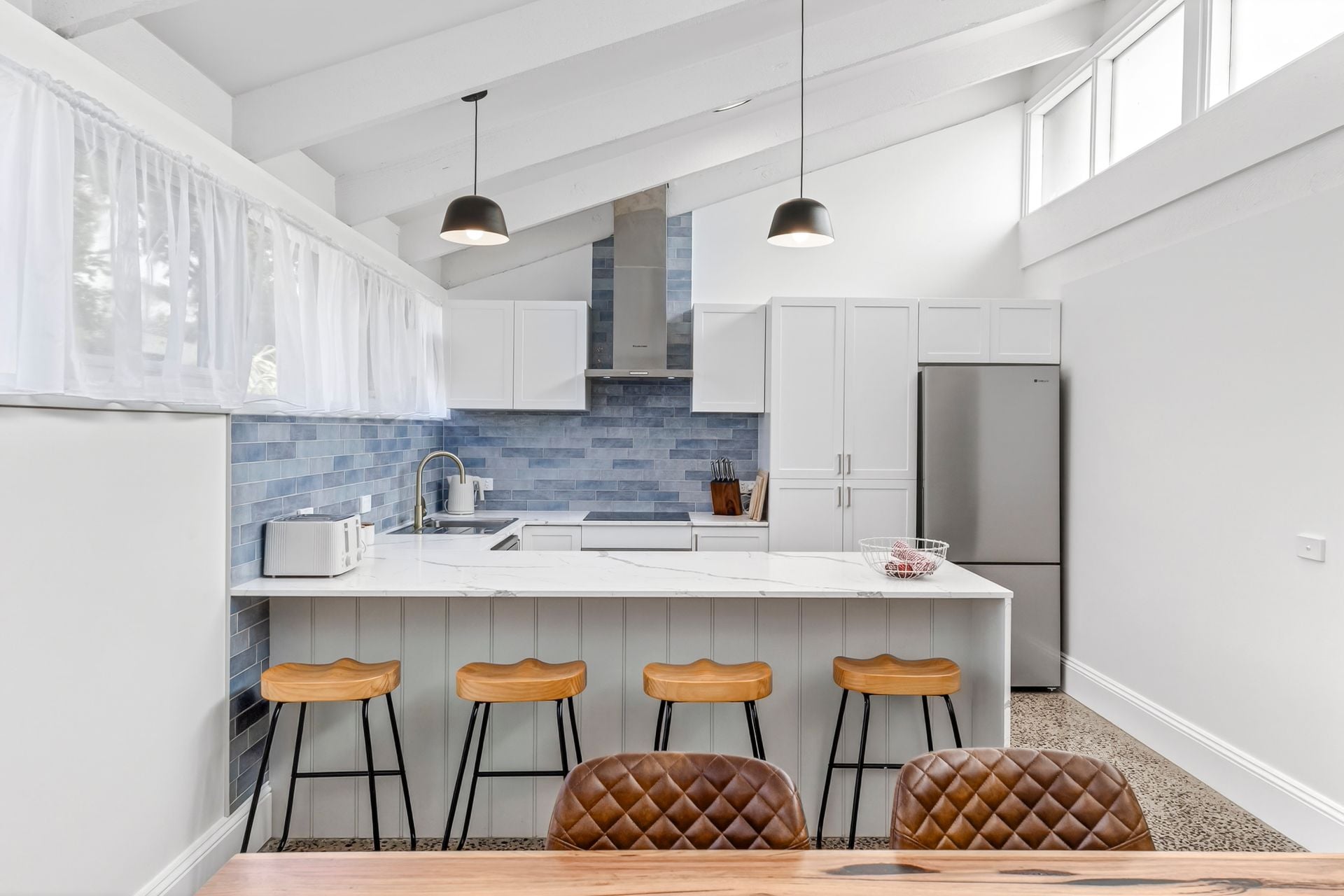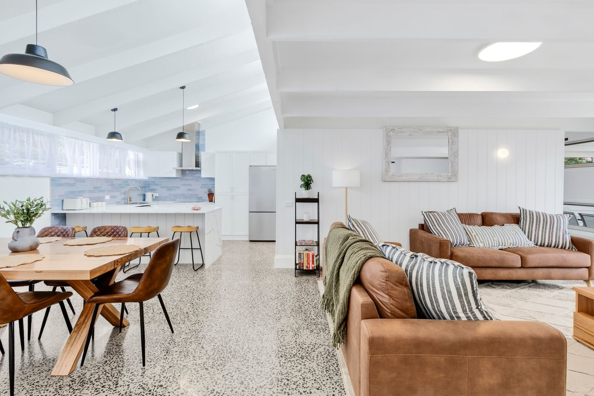 Beautifully transformed, the interiors showcase polished concrete floors, contemporary finishes and a cohesive coastal aesthetic. Open plan meals and living is elevated by a high raked ceiling with exposed beams, while clerestory windows invite abundant north-facing light into the heart of the home.