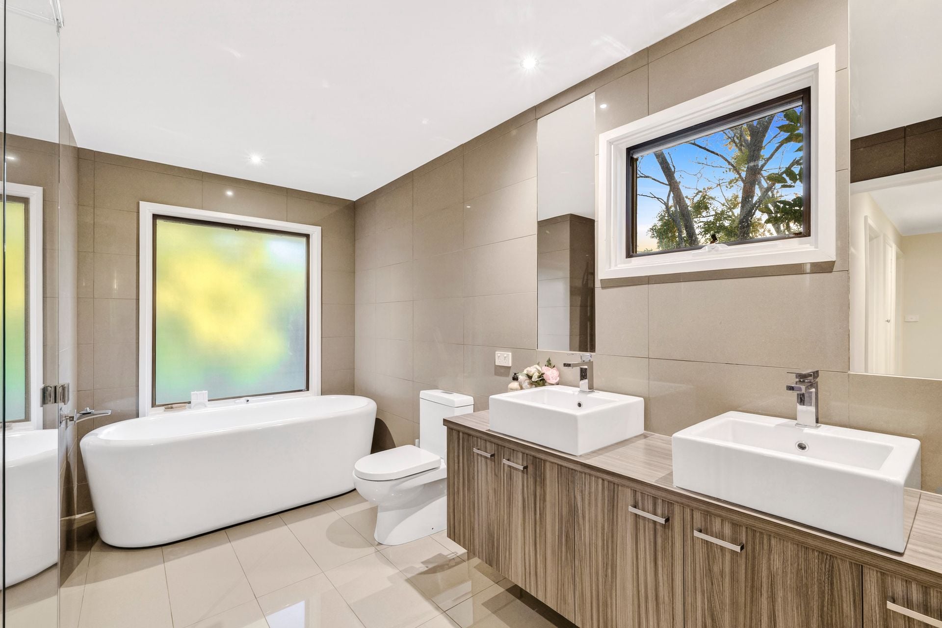 -Full family bathroom indulges with twin vanity, floor-to-ceiling tiling, and sumptuous freestanding tub