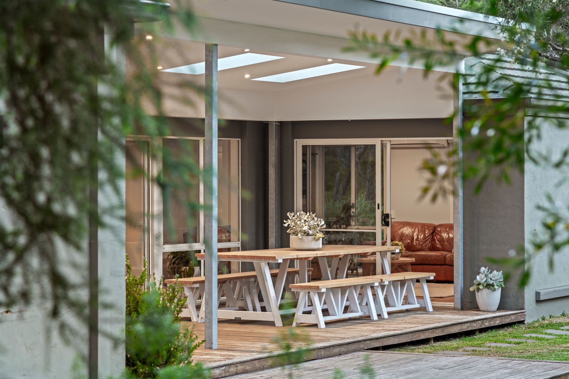 -Architect-designed covered alfresco with raked western roofline & skylights