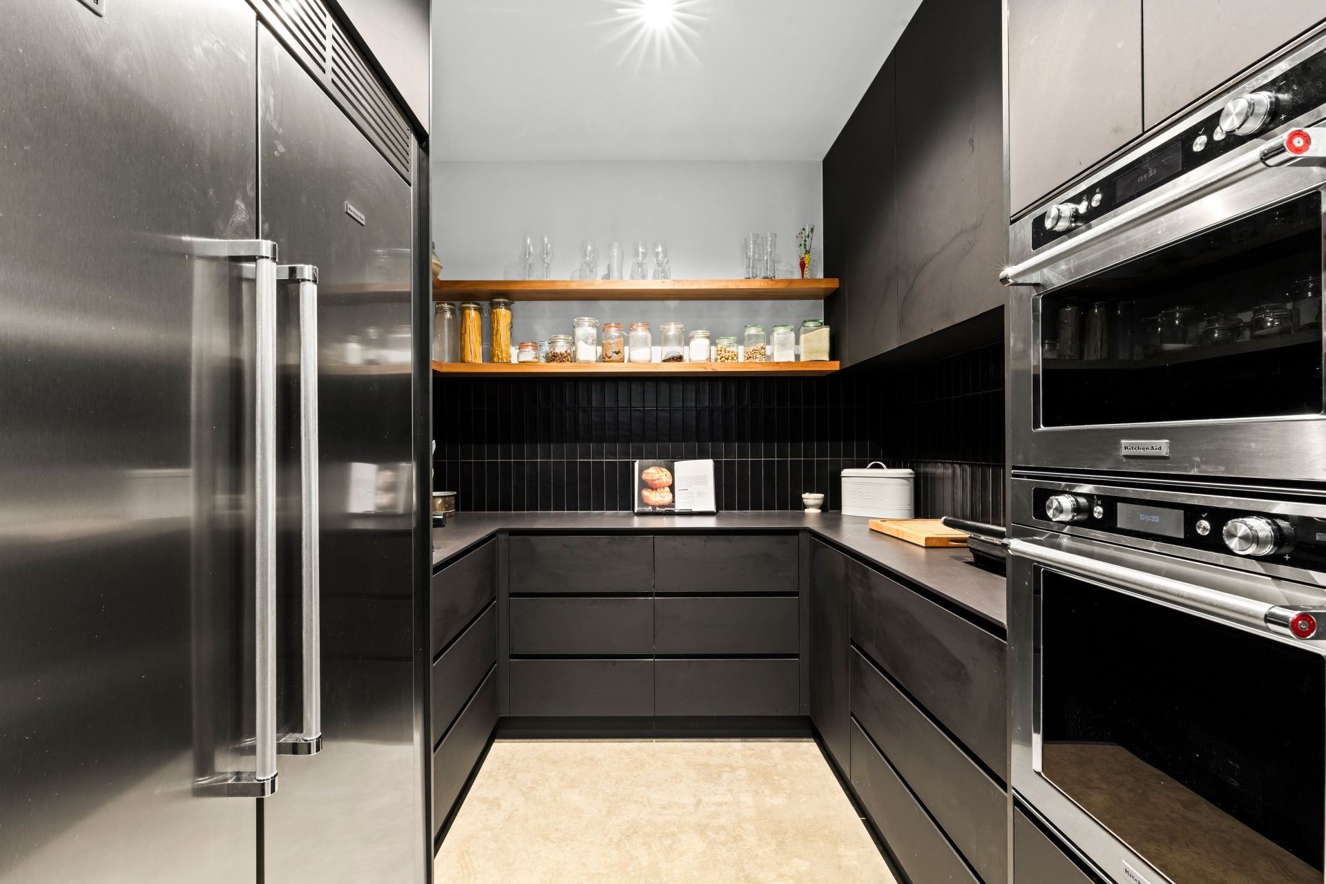 -Concealed butler’s pantry features beautiful open timber shelving