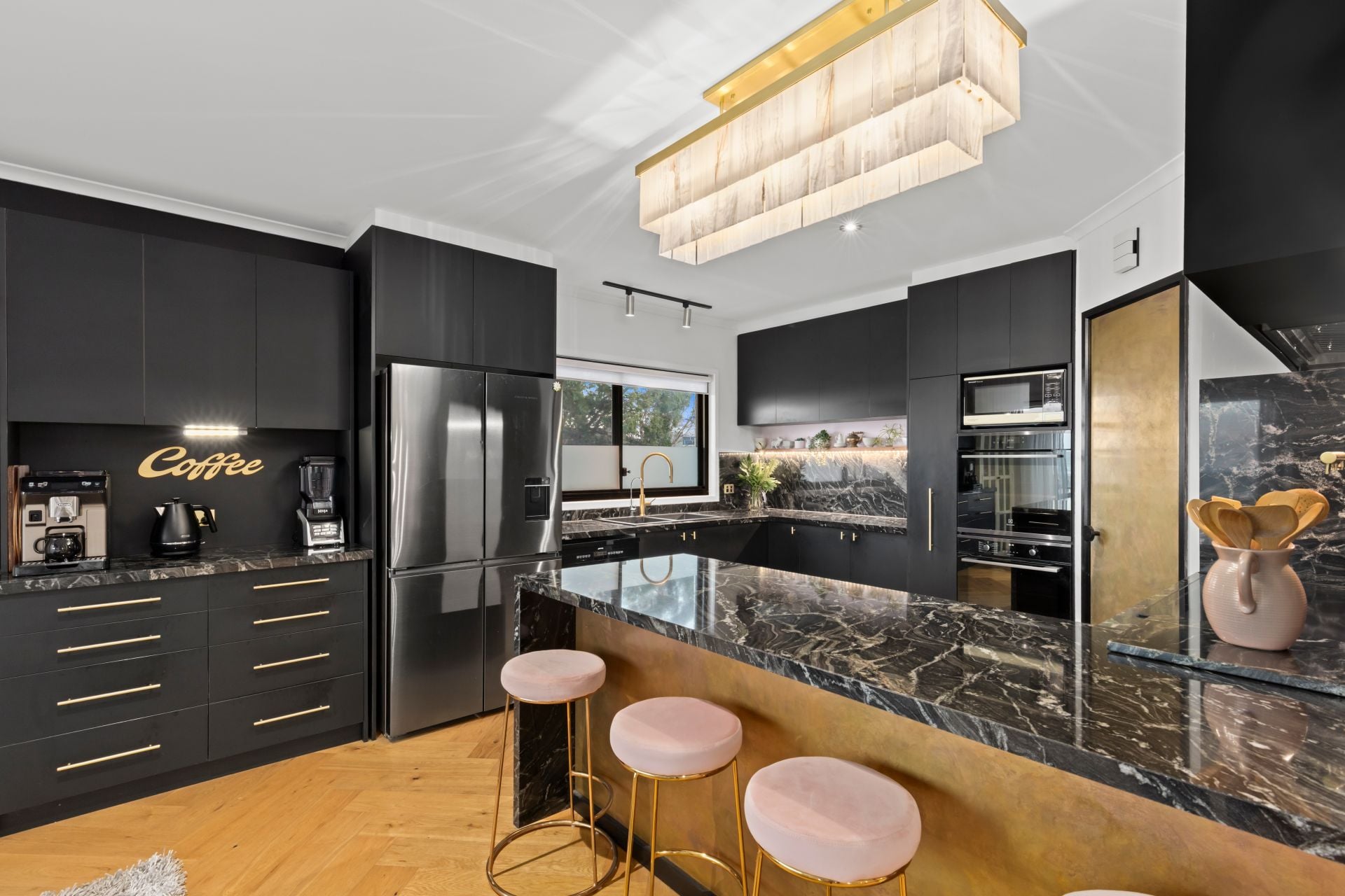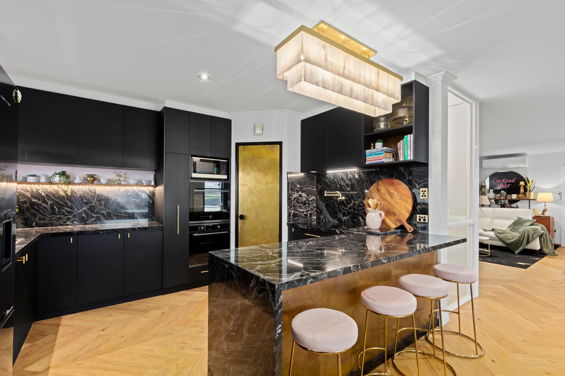 -Granite clad kitchen makes a sophisticated statement, enhanced with striking brass panelling & an alabaster chandelier