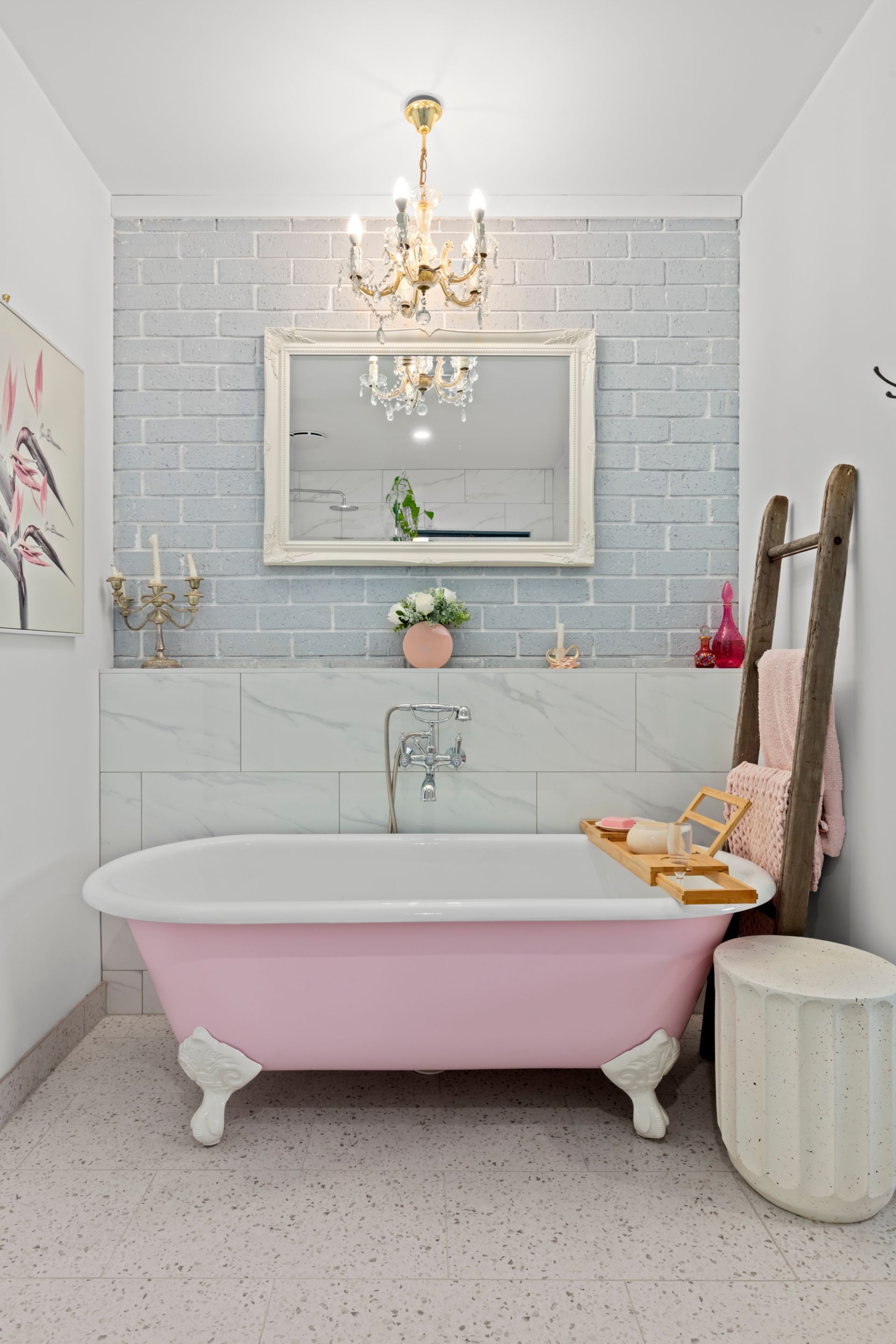 -Main bathroom delights with a pink cast iron clawfoot tub, terrazzo floor tiling, stone-topped vanity & marble herringbone feature tiles