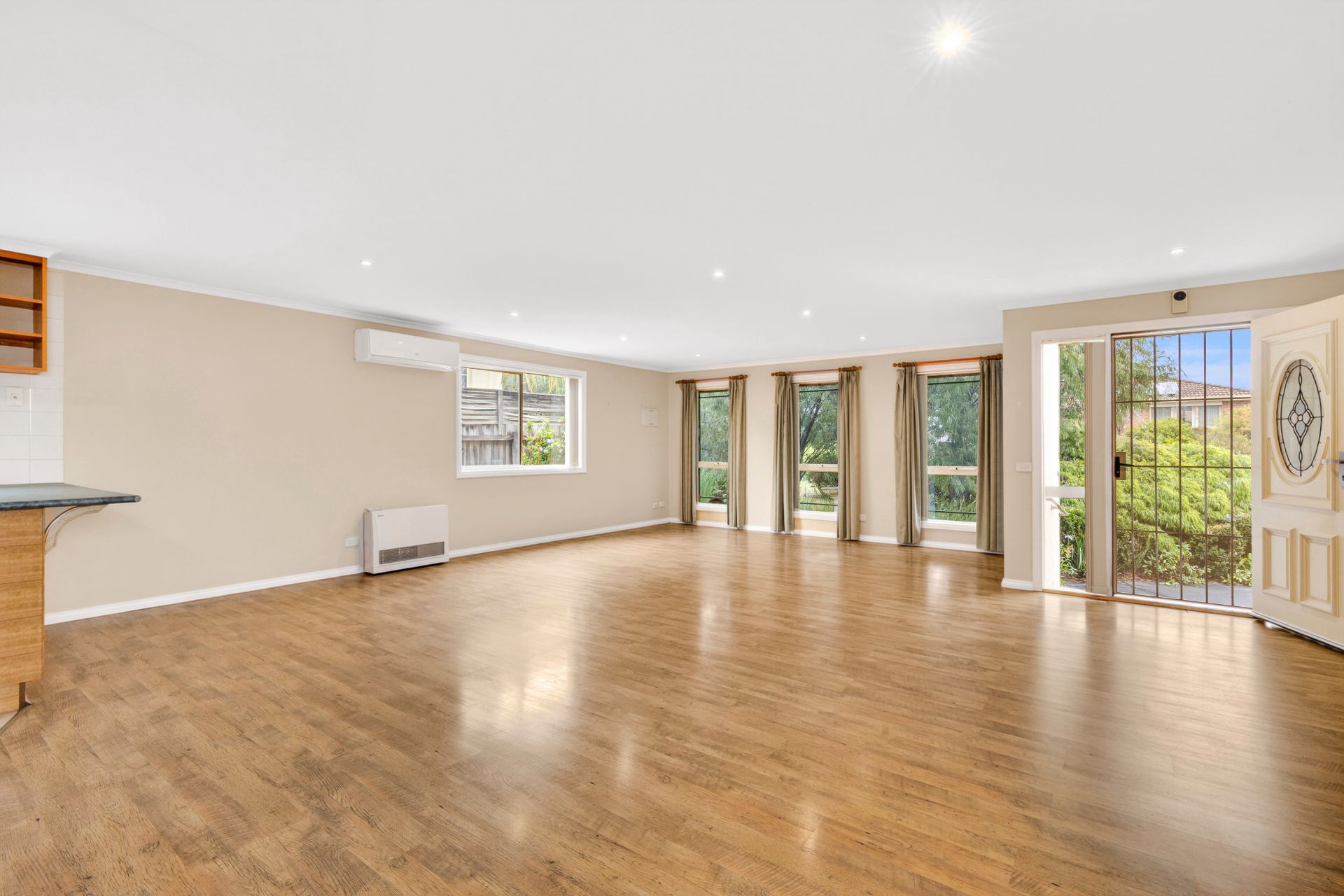 The central bathroom is well-appointed with a shower, bath, and separate toilet, ideal for busy households. At the heart of the home, a large open-plan kitchen, living, and dining area creates a welcoming space perfect for everyday living and entertaining. Enjoy year-round comfort with a split system and wall heater in the main living zone.